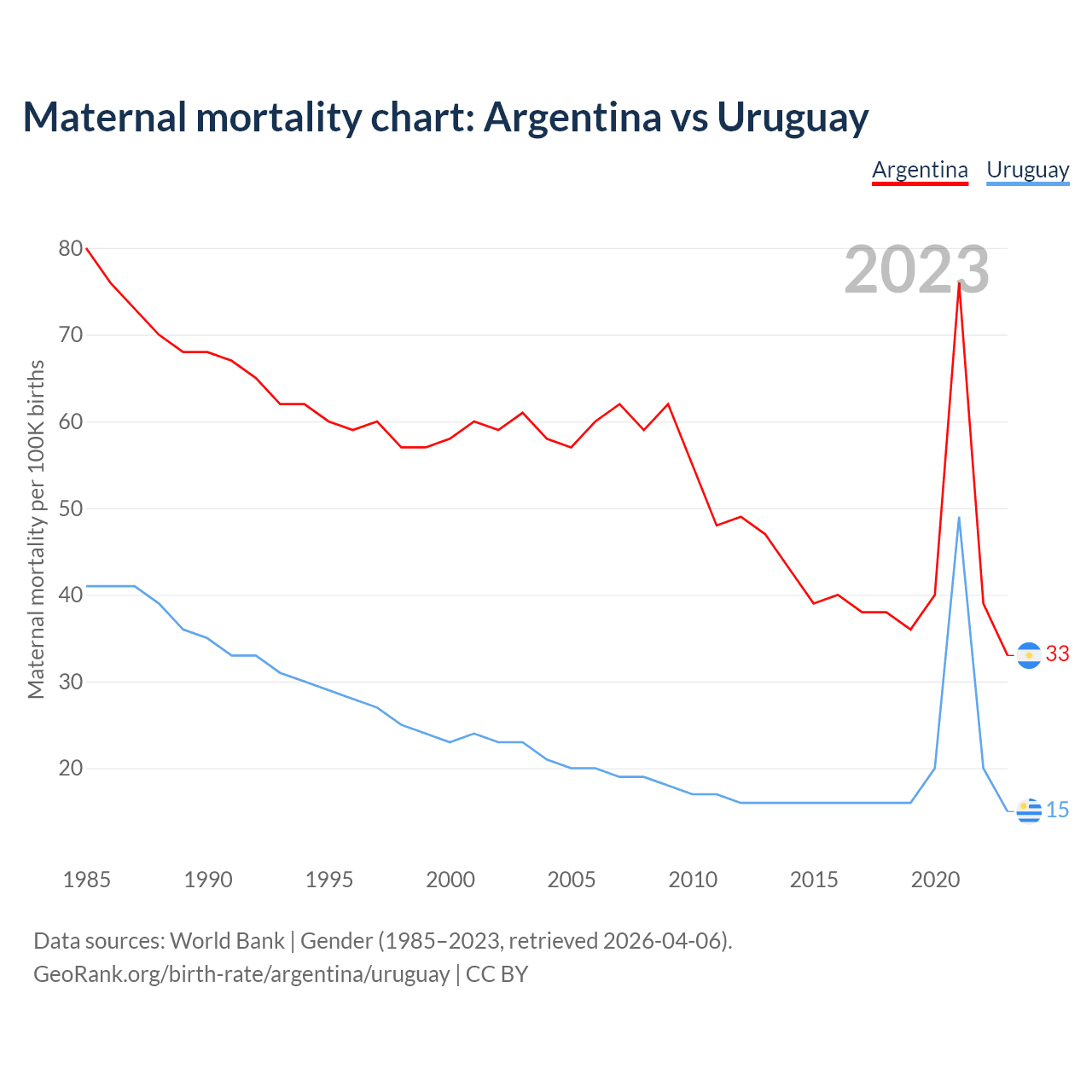 The maternal mortality rate, which is the probability of dying during childbirth or within 42 days of pregnancy termination, is 33 deaths per 100,000 live births in Argentina, compared to 15 deaths in Uruguay.