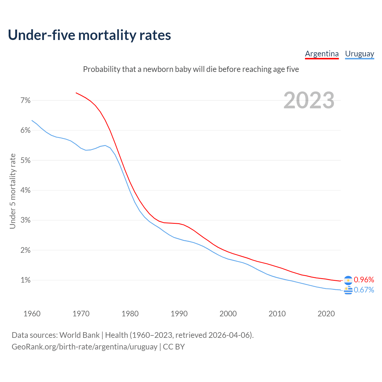 The chance that a newborn baby will die before reaching age five is 0.96% in Argentina and 0.67% in Uruguay. Above is a chart with historical data on under-five mortality rates.