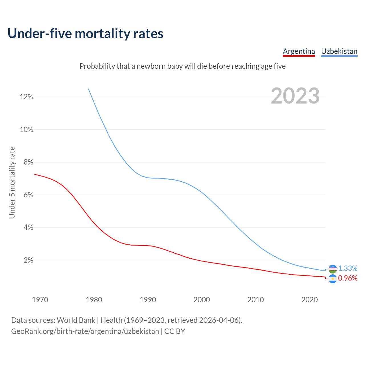 The chance that a newborn baby will die before reaching age five is 0.96% in Argentina and 1.33% in Uzbekistan. Above is a chart with historical data on under-five mortality rates.