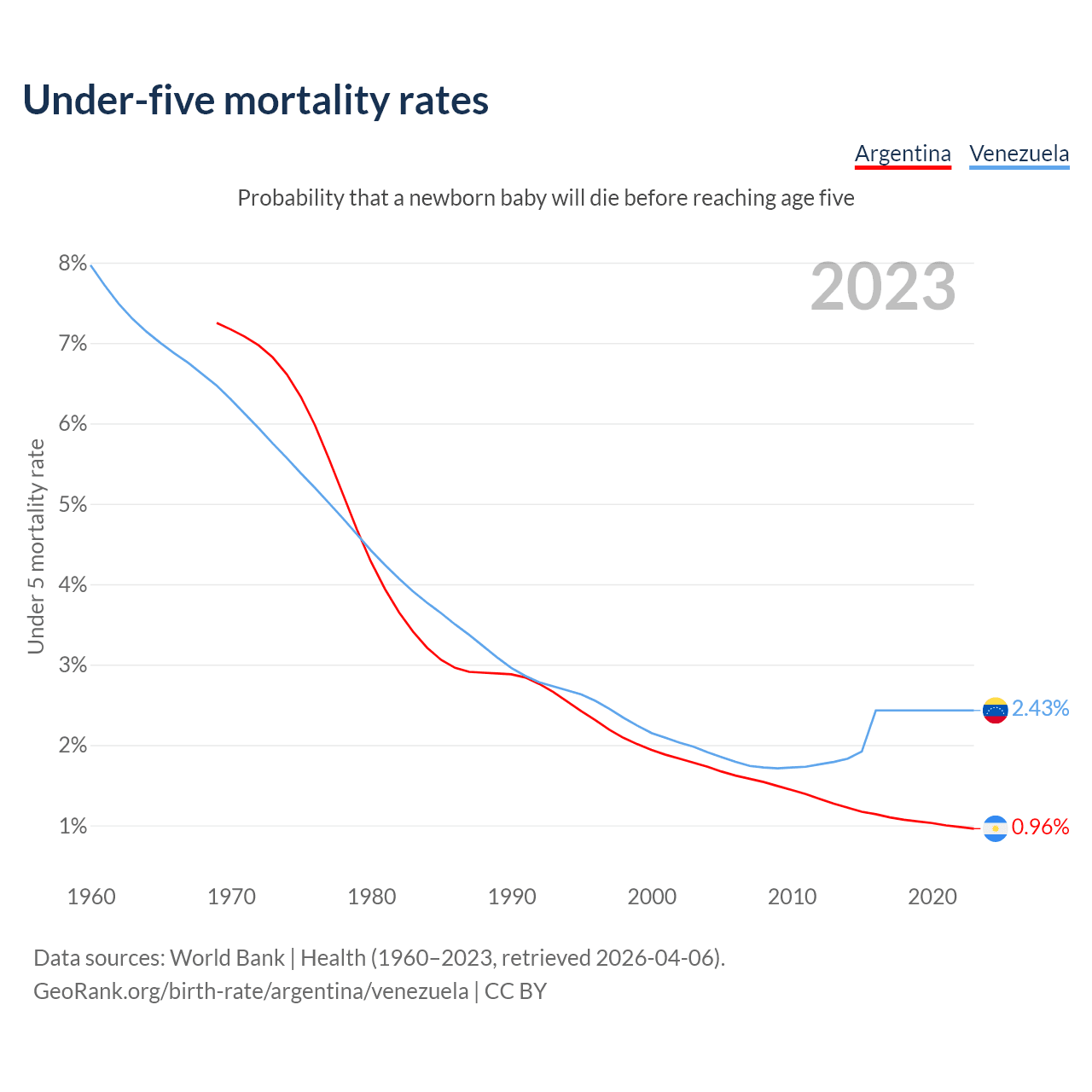 The chance that a newborn baby will die before reaching age five is 0.96% in Argentina and 2.43% in Venezuela. Above is a chart with historical data on under-five mortality rates.