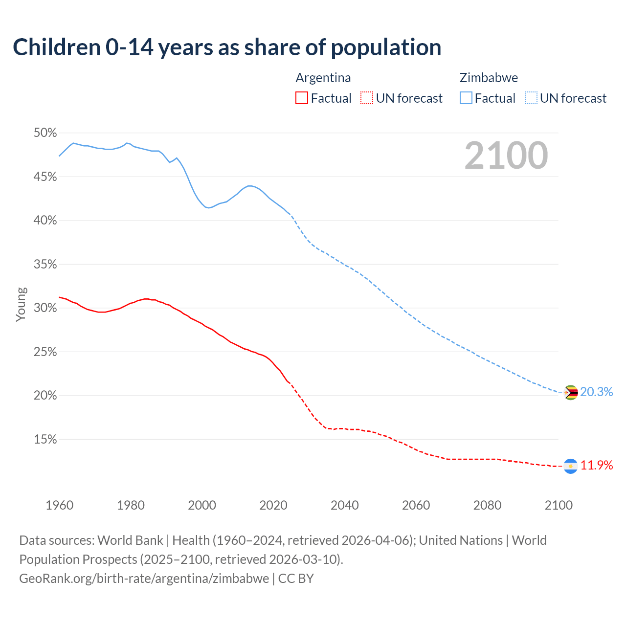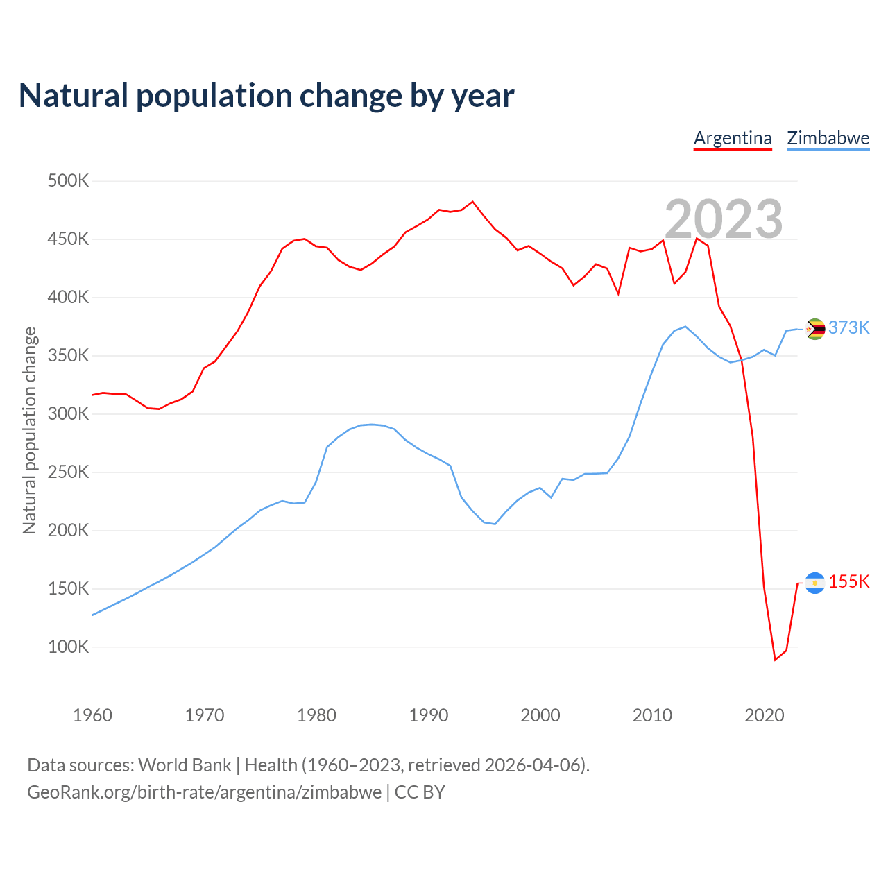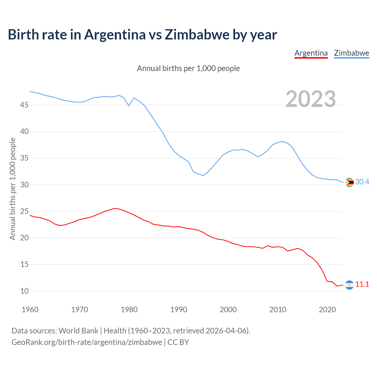 Argentina has an annual birth rate of 11.1 births per 1,000 people, compared to 30.4 for Zimbabwe. The average number of children a woman is expected to have during her lifetime — the fertility rate, is 1.5 in Argentina and 3.72 in Zimbabwe — 148.3% difference.