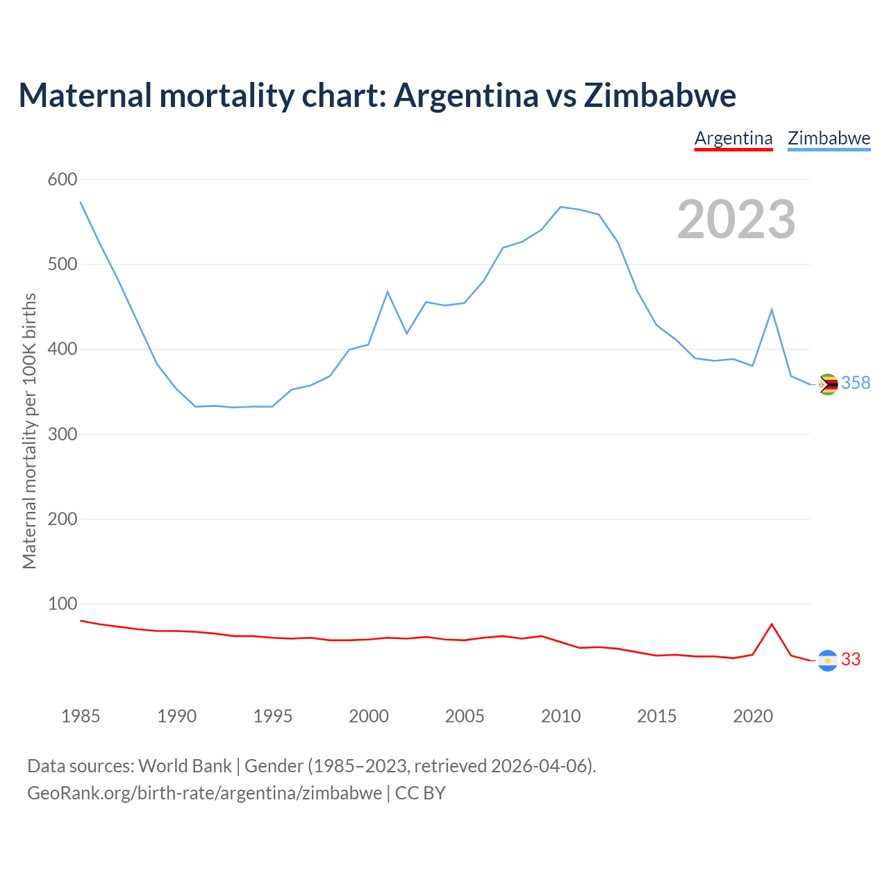 The maternal mortality rate, which is the probability of dying during childbirth or within 42 days of pregnancy termination, is 33 deaths per 100,000 live births in Argentina, compared to 358 deaths in Zimbabwe.