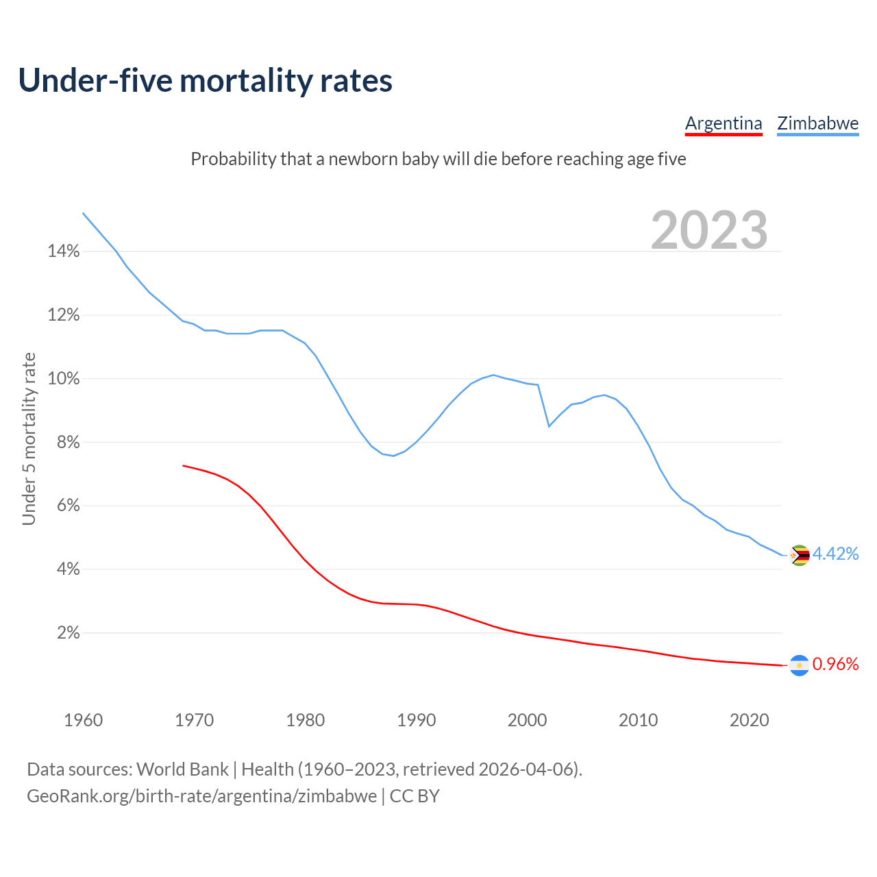 The chance that a newborn baby will die before reaching age five is 0.96% in Argentina and 4.42% in Zimbabwe. Above is a chart with historical data on under-five mortality rates.