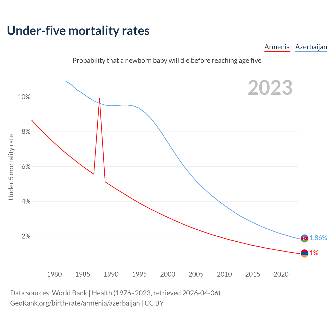 The chance that a newborn baby will die before reaching age five is 1% in Armenia and 1.86% in Azerbaijan. Above is a chart with historical data on under-five mortality rates.