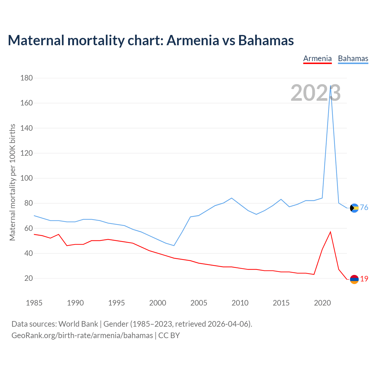 The maternal mortality rate, which is the probability of dying during childbirth or within 42 days of pregnancy termination, is 19 deaths per 100,000 live births in Armenia, compared to 76 deaths in the Bahamas.
