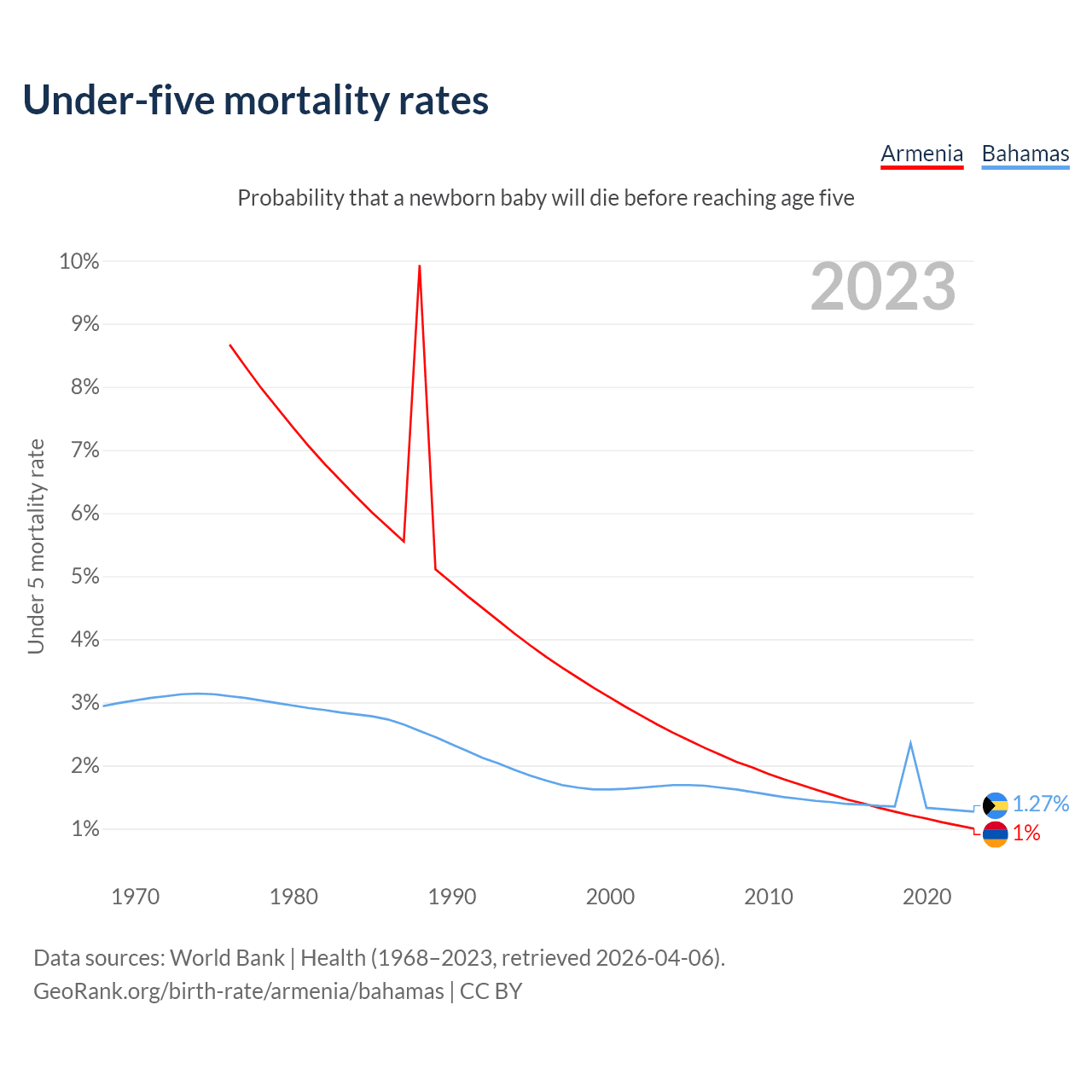 The chance that a newborn baby will die before reaching age five is 1% in Armenia and 1.27% in the Bahamas. Above is a chart with historical data on under-five mortality rates.