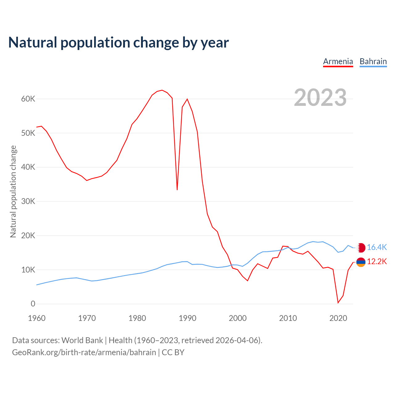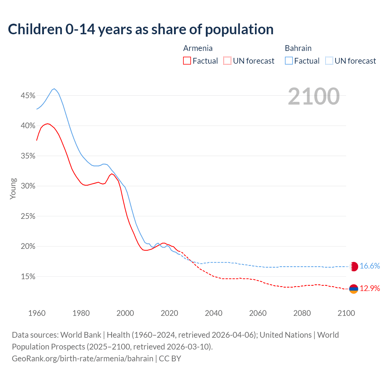 Armenia has an annual birth rate of 12.3 births per 1,000 people, compared to 12.5 for Bahrain. The average number of children a woman is expected to have during her lifetime — the fertility rate, is 1.9 in Armenia and 1.82 in Bahrain — 4% difference.