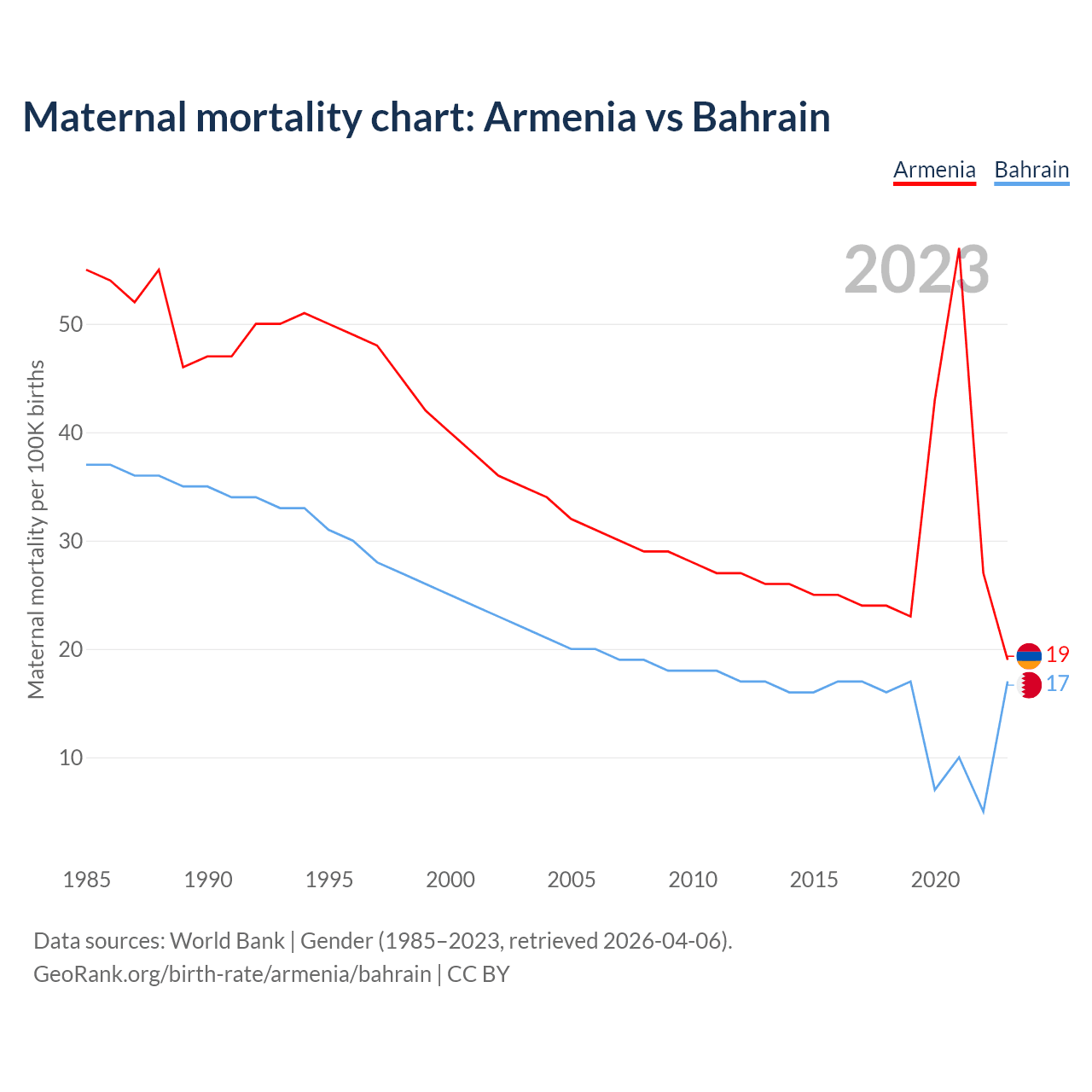 The maternal mortality rate, which is the probability of dying during childbirth or within 42 days of pregnancy termination, is 19 deaths per 100,000 live births in Armenia, compared to 17 deaths in Bahrain.