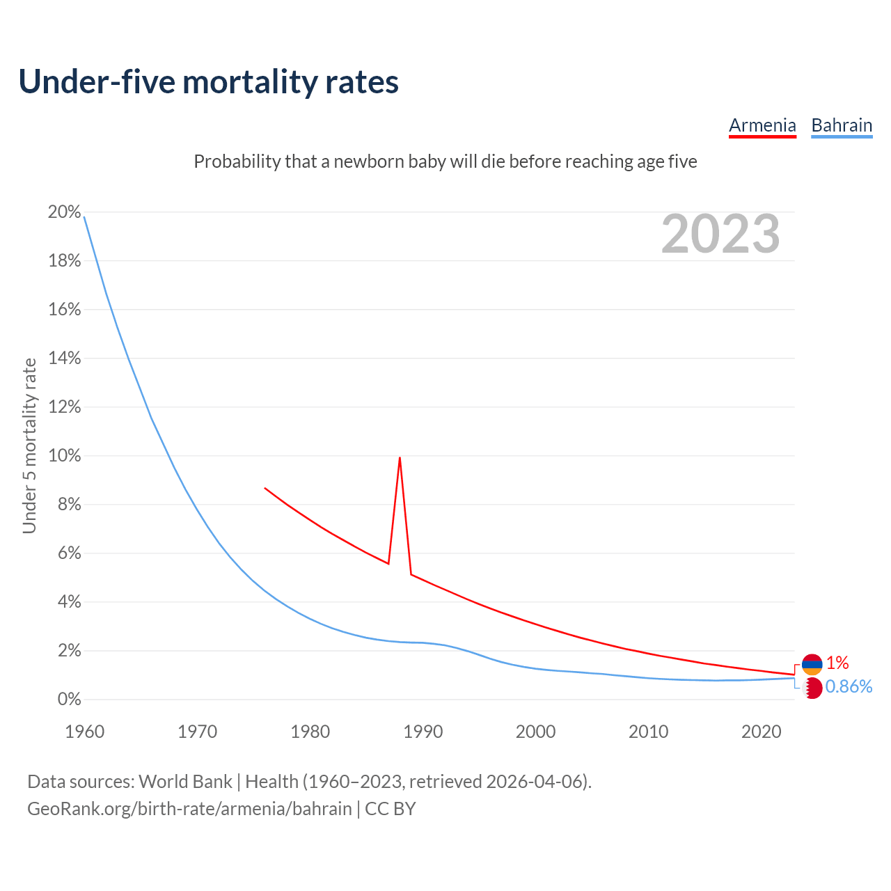 The chance that a newborn baby will die before reaching age five is 1% in Armenia and 0.86% in Bahrain. Above is a chart with historical data on under-five mortality rates.