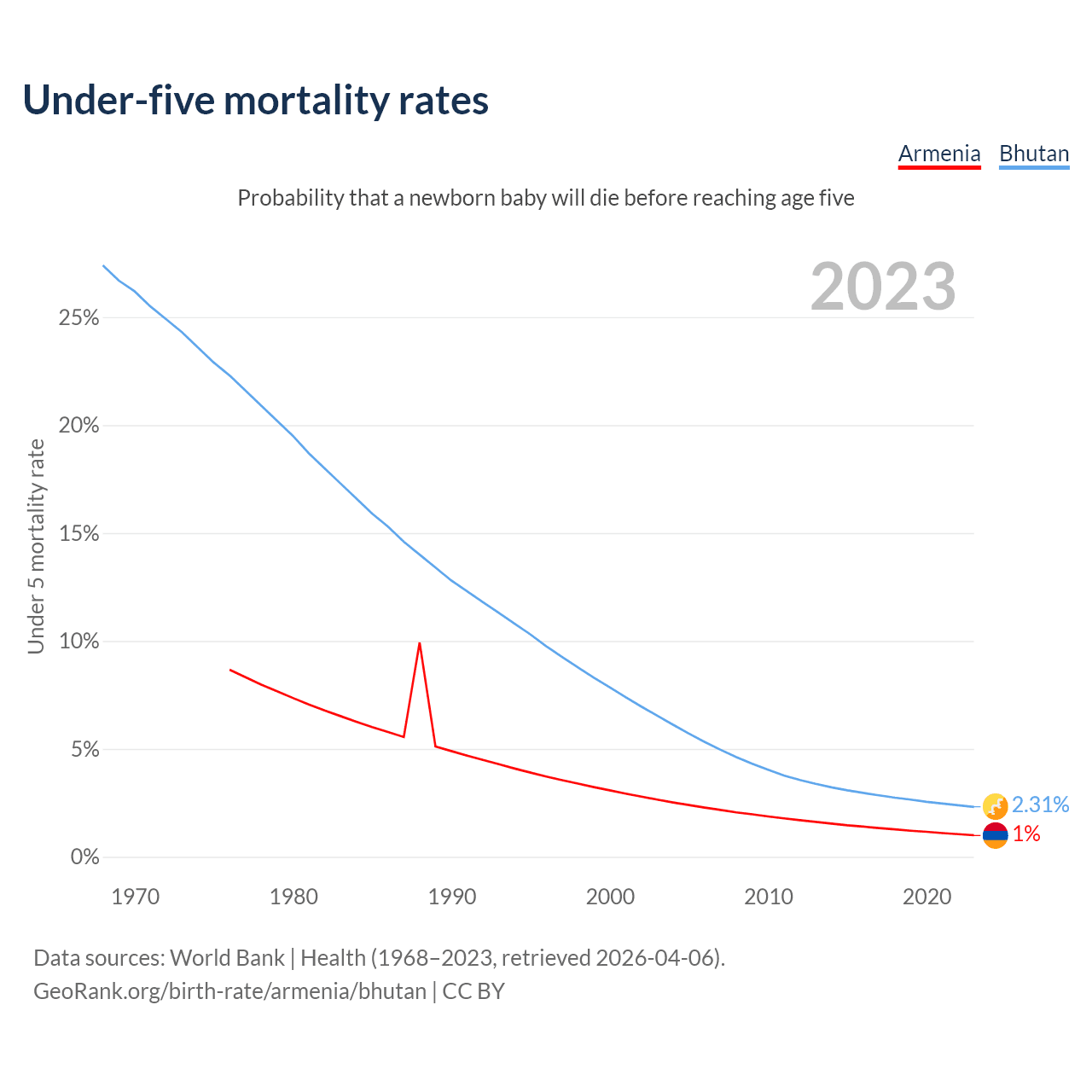 The chance that a newborn baby will die before reaching age five is 1% in Armenia and 2.31% in Bhutan. Above is a chart with historical data on under-five mortality rates.