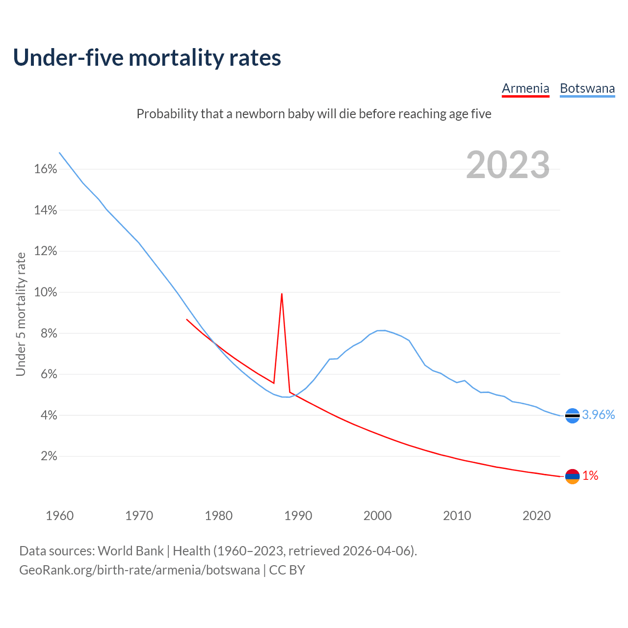 The chance that a newborn baby will die before reaching age five is 1% in Armenia and 3.96% in Botswana. Above is a chart with historical data on under-five mortality rates.