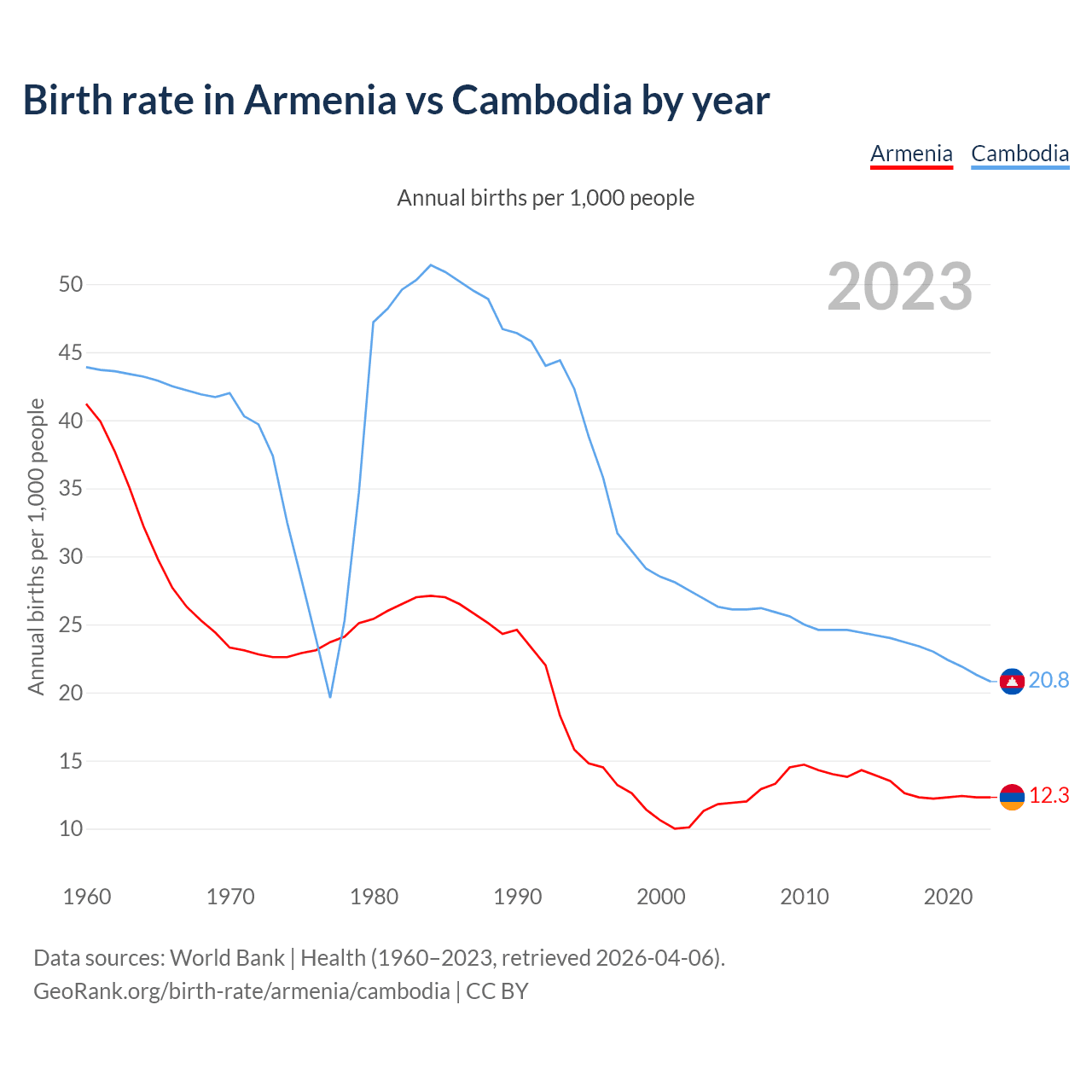 Armenia has an annual birth rate of 12.3 births per 1,000 people, compared to 20.8 for Cambodia. The average number of children a woman is expected to have during her lifetime — the fertility rate, is 1.9 in Armenia and 2.58 in Cambodia — 35.7% difference.