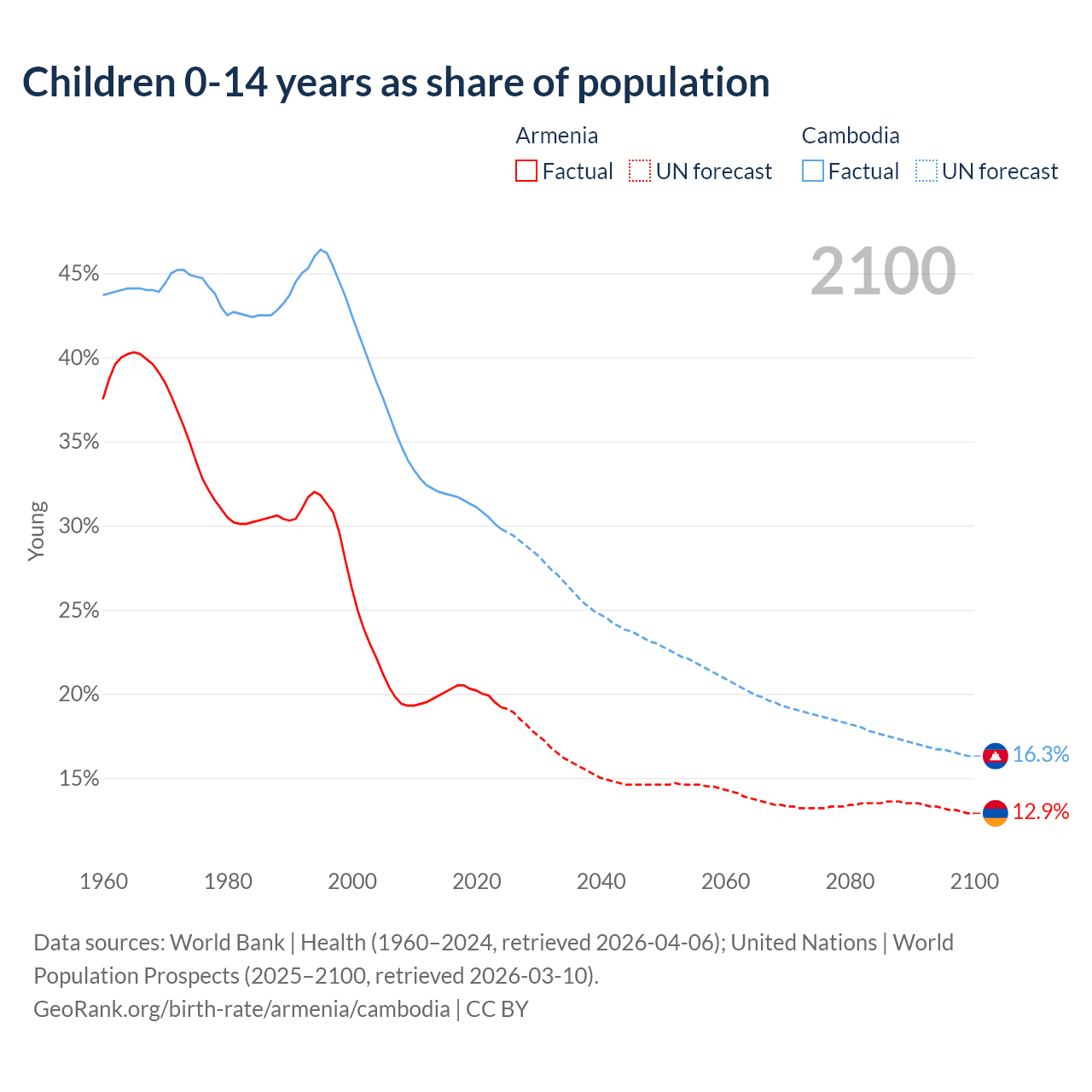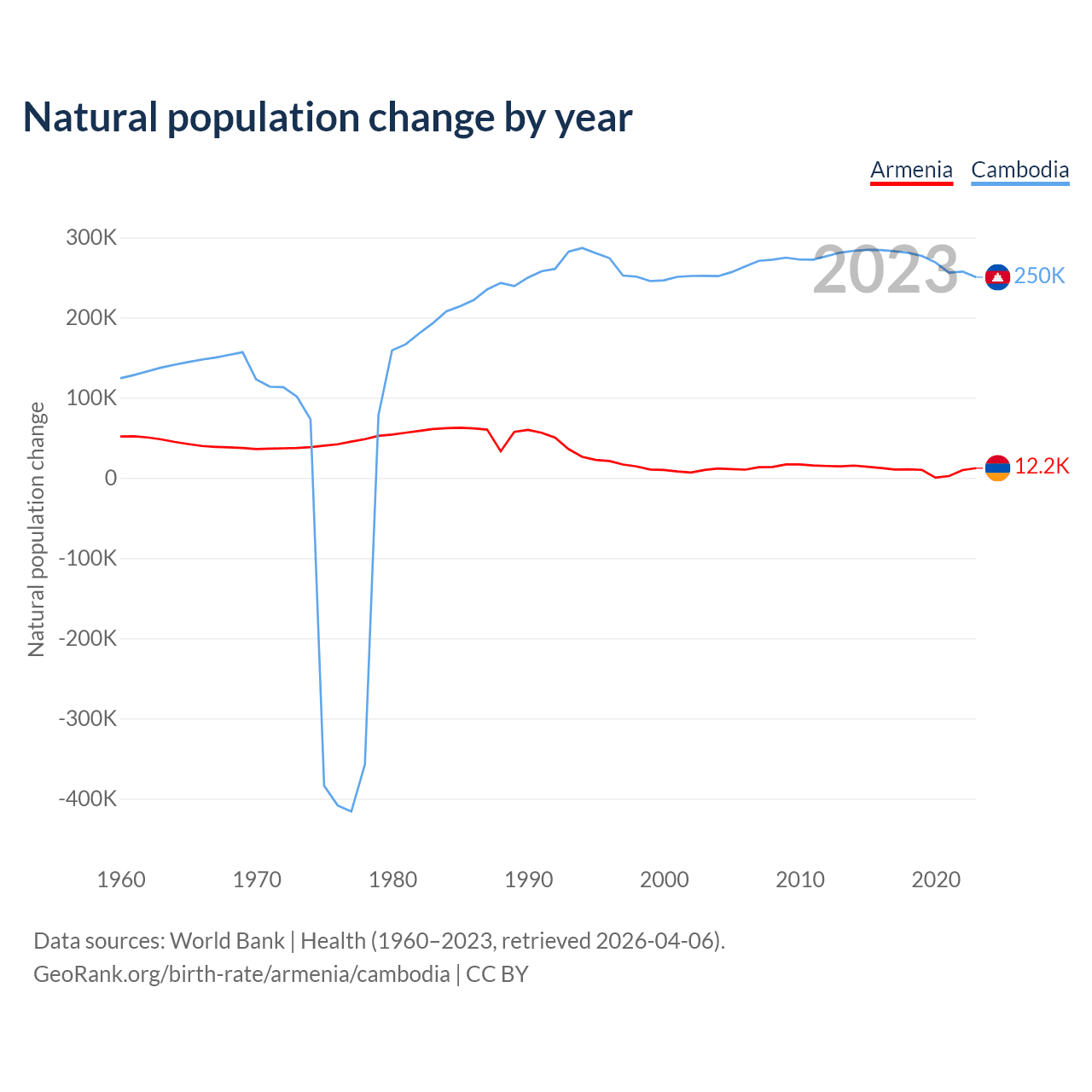 According to the latest available data on birth rates, the fertility rate in Armenia was 1.9 children per woman in 2023, compared to 2.58 in Cambodia in 2023. The replacement level is considered to be 2.1 children per woman.