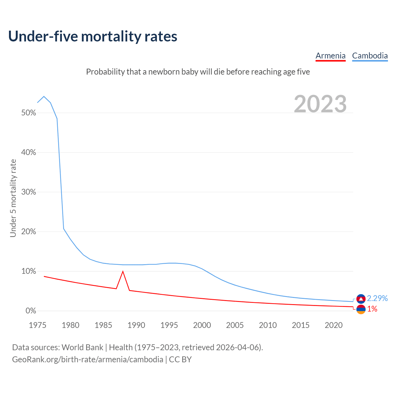 The chance that a newborn baby will die before reaching age five is 1% in Armenia and 2.29% in Cambodia. Above is a chart with historical data on under-five mortality rates.