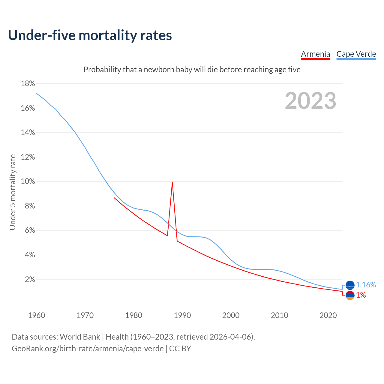 The chance that a newborn baby will die before reaching age five is 1% in Armenia and 1.16% in Cape Verde. Above is a chart with historical data on under-five mortality rates.
