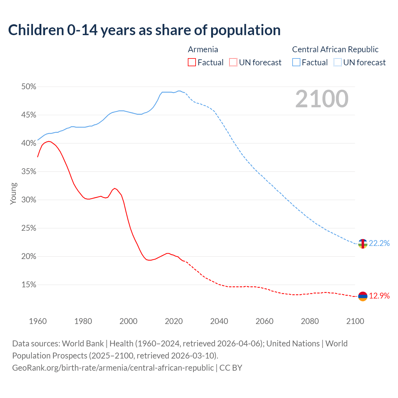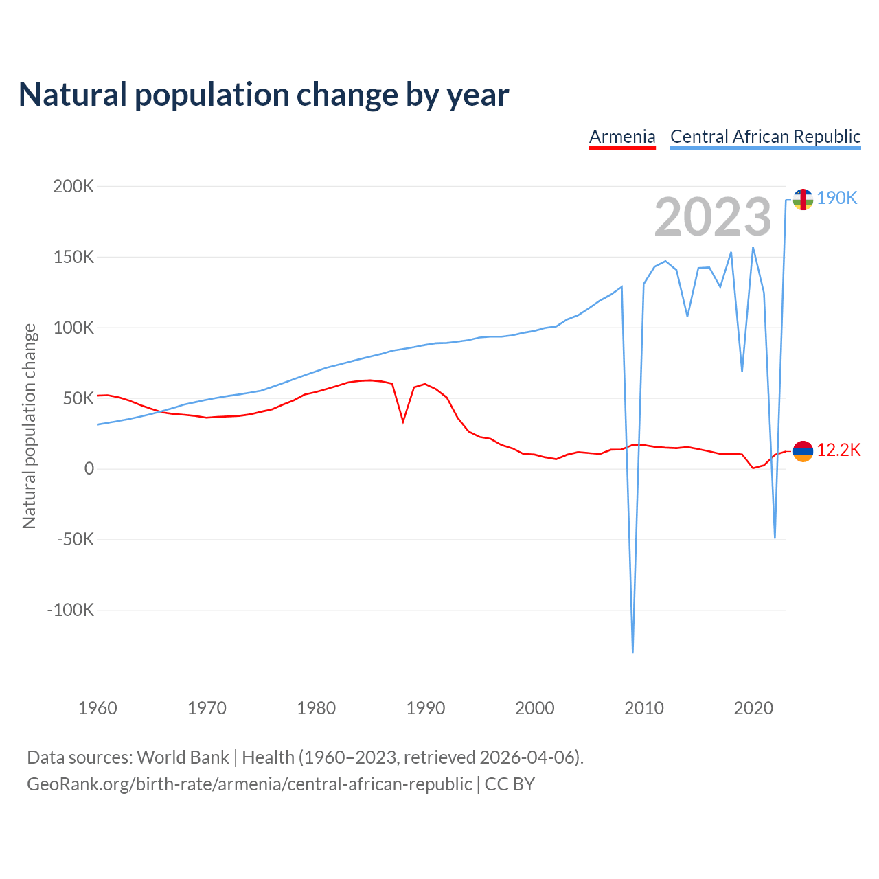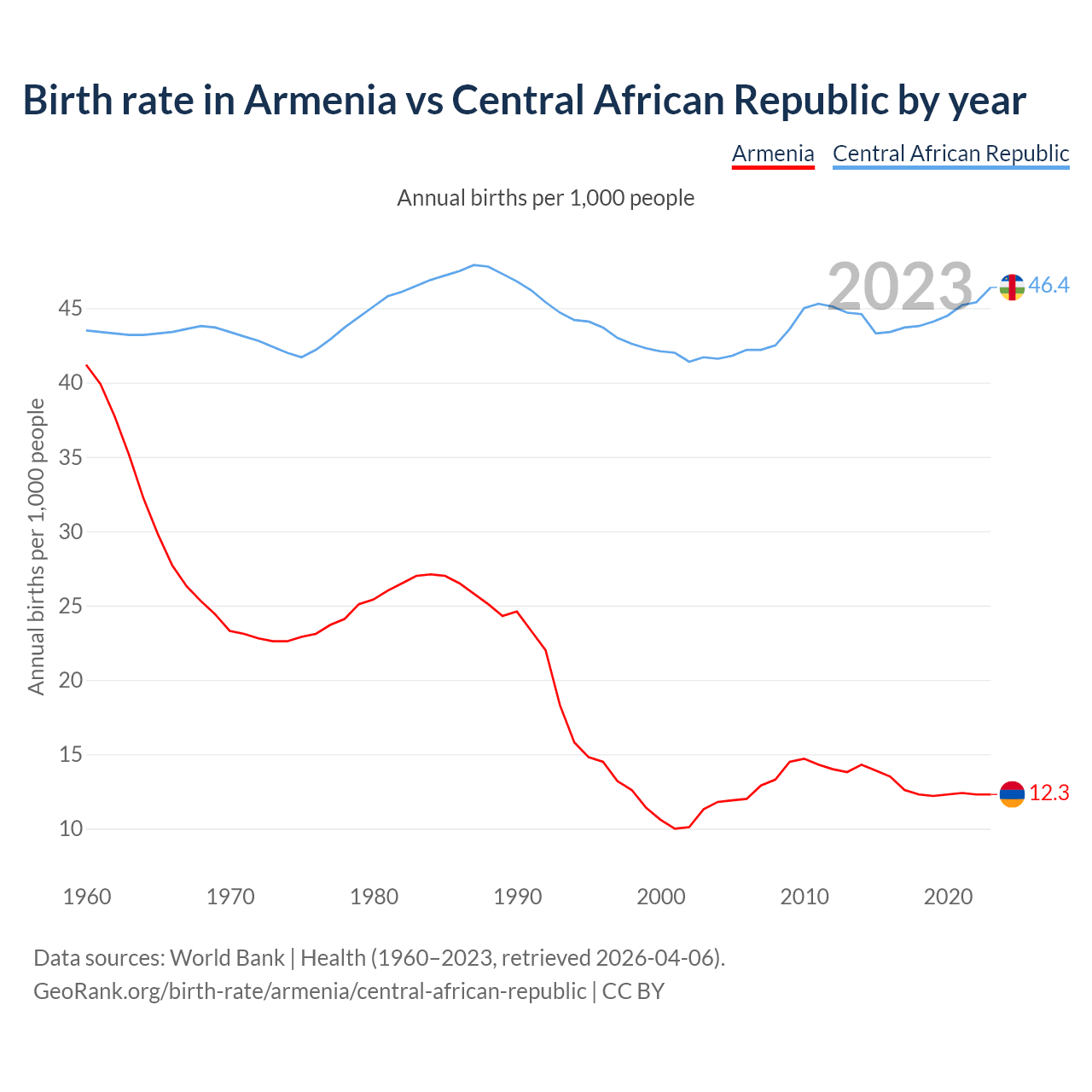 Armenia has an annual birth rate of 12.3 births per 1,000 people, compared to 46.4 for the Central African Republic. The average number of children a woman is expected to have during her lifetime — the fertility rate, is 1.9 in Armenia and 6.01 in the Central African Republic — 216.4% difference.