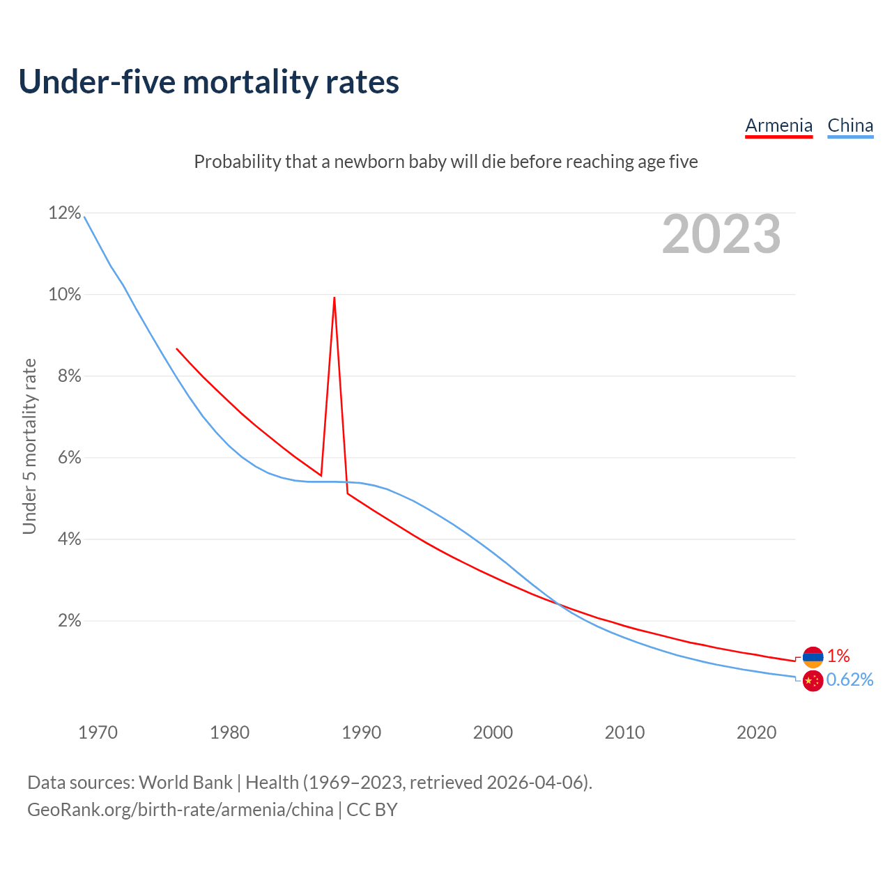 The chance that a newborn baby will die before reaching age five is 1% in Armenia and 0.62% in China. Above is a chart with historical data on under-five mortality rates.