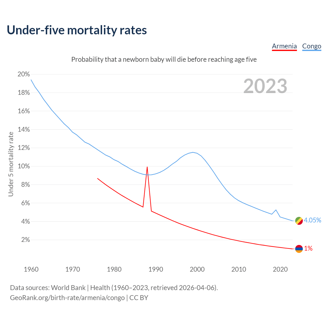 The chance that a newborn baby will die before reaching age five is 1% in Armenia and 4.05% in the Congo. Above is a chart with historical data on under-five mortality rates.