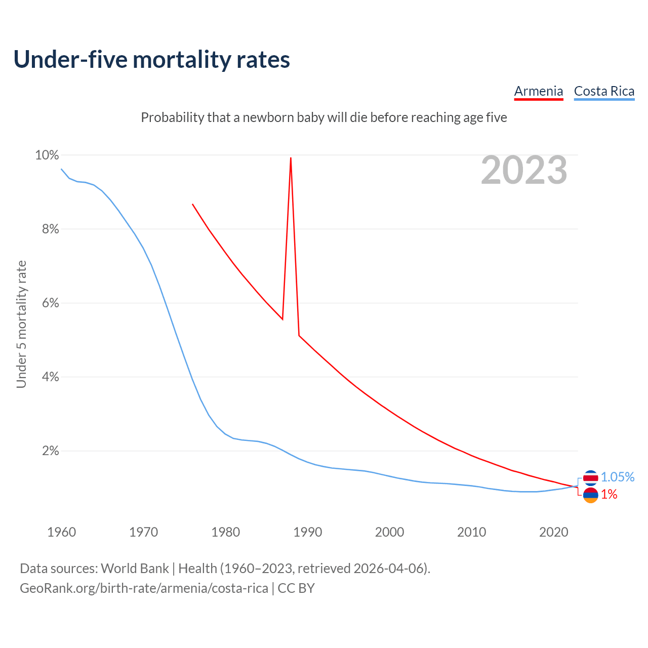 The chance that a newborn baby will die before reaching age five is 1% in Armenia and 1.05% in Costa Rica. Above is a chart with historical data on under-five mortality rates.