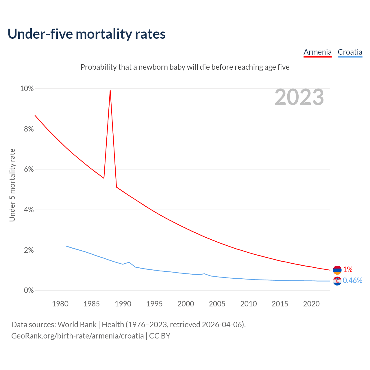 The chance that a newborn baby will die before reaching age five is 1% in Armenia and 0.46% in Croatia. Above is a chart with historical data on under-five mortality rates.