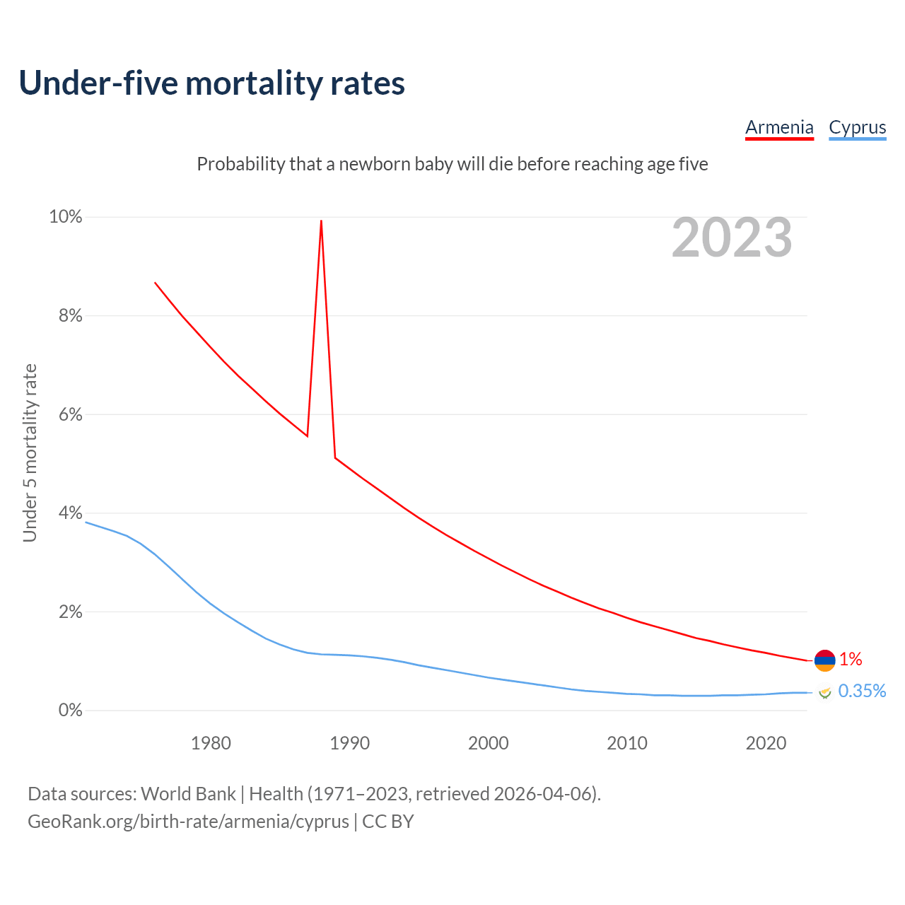 The chance that a newborn baby will die before reaching age five is 1% in Armenia and 0.35% in Cyprus. Above is a chart with historical data on under-five mortality rates.