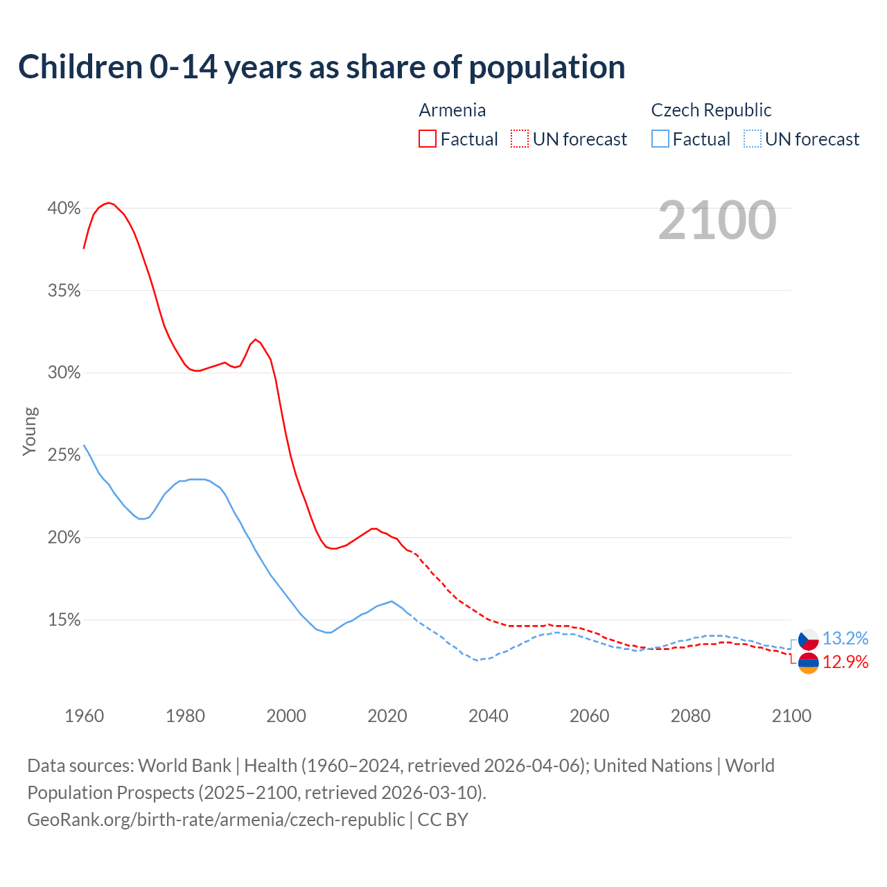 Armenia has an annual birth rate of 12.3 births per 1,000 people, compared to 8.4 for the Czech Republic. The average number of children a woman is expected to have during her lifetime — the fertility rate, is 1.9 in Armenia and 1.45 in the Czech Republic — 23.7% difference.