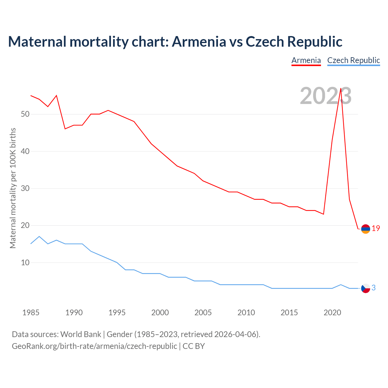 The maternal mortality rate, which is the probability of dying during childbirth or within 42 days of pregnancy termination, is 19 deaths per 100,000 live births in Armenia, compared to 3 deaths in the Czech Republic.