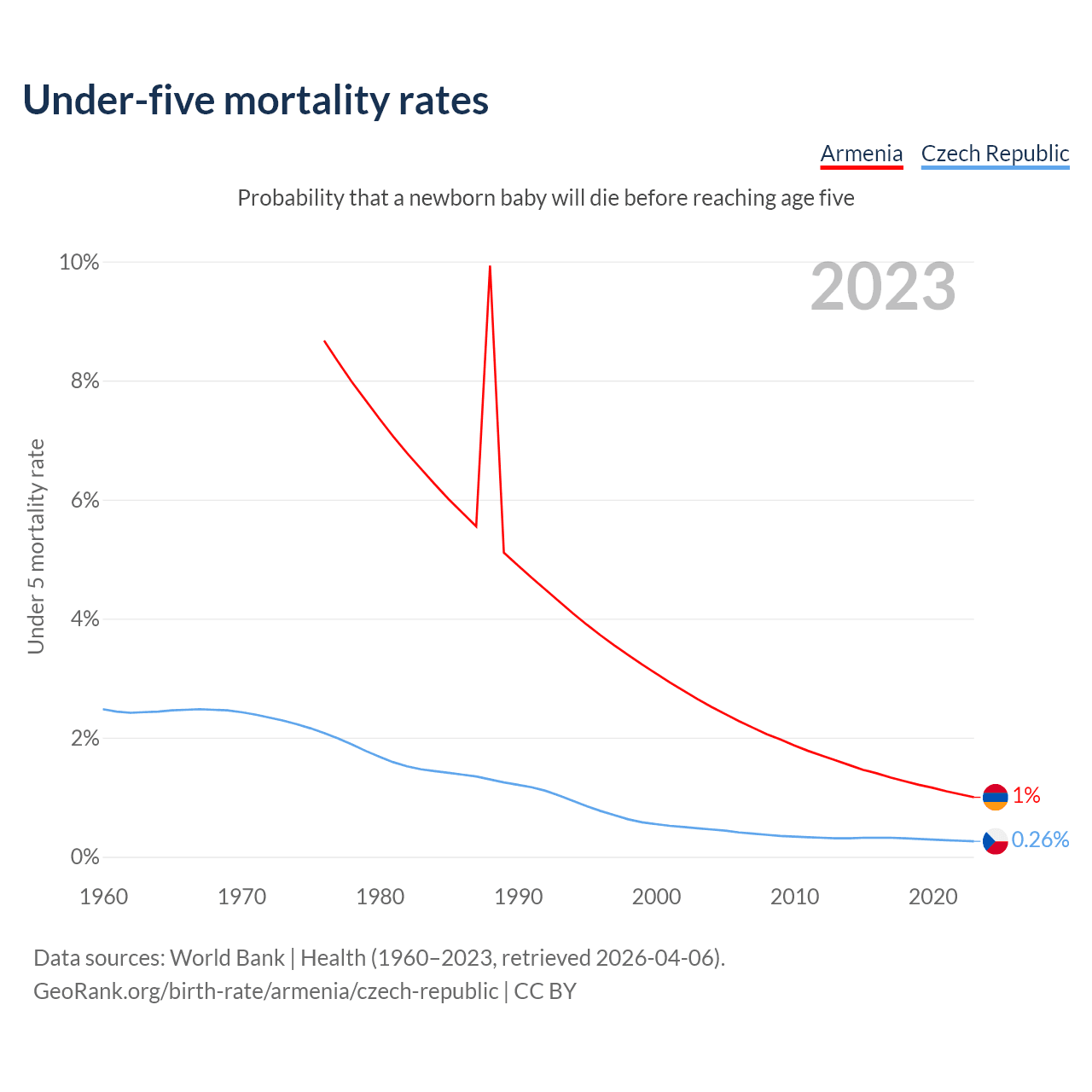 The chance that a newborn baby will die before reaching age five is 1% in Armenia and 0.26% in the Czech Republic. Above is a chart with historical data on under-five mortality rates.