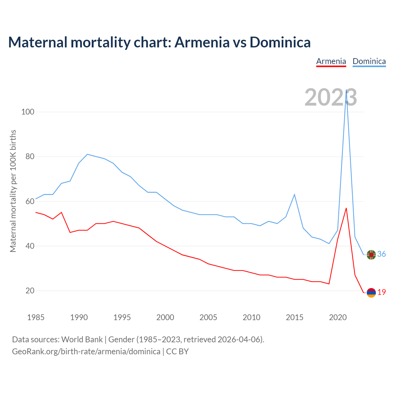 The maternal mortality rate, which is the probability of dying during childbirth or within 42 days of pregnancy termination, is 19 deaths per 100,000 live births in Armenia, compared to 36 deaths in Dominica.