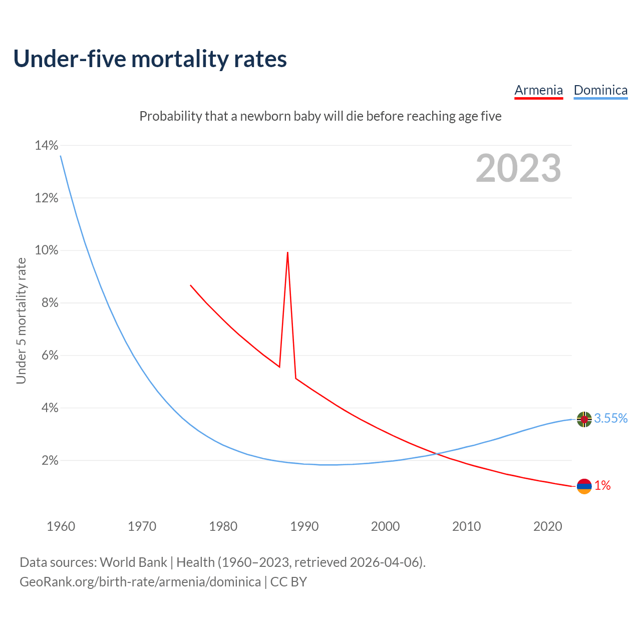 The chance that a newborn baby will die before reaching age five is 1% in Armenia and 3.55% in Dominica. Above is a chart with historical data on under-five mortality rates.