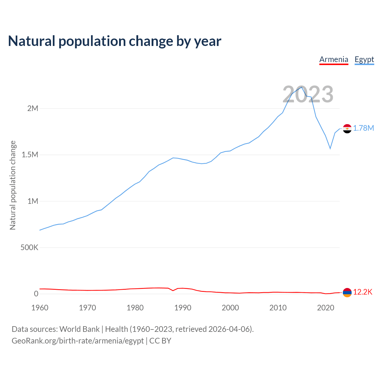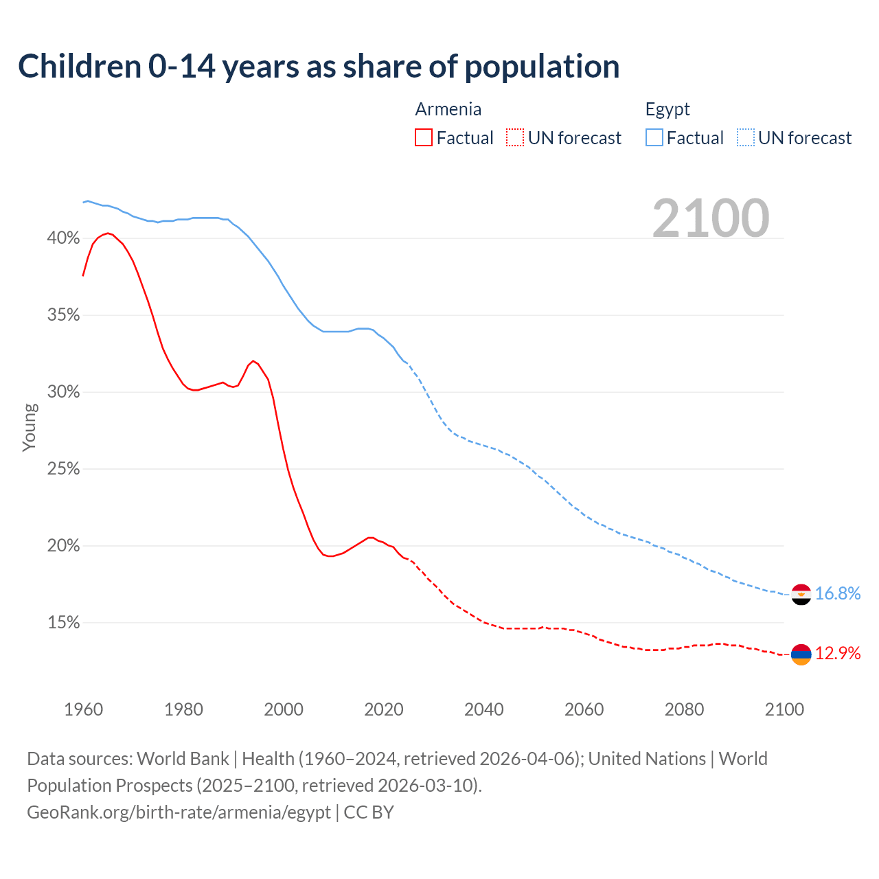 Armenia has an annual birth rate of 12.3 births per 1,000 people, compared to 21 for Egypt. The average number of children a woman is expected to have during her lifetime — the fertility rate, is 1.9 in Armenia and 2.75 in Egypt — 44.7% difference.