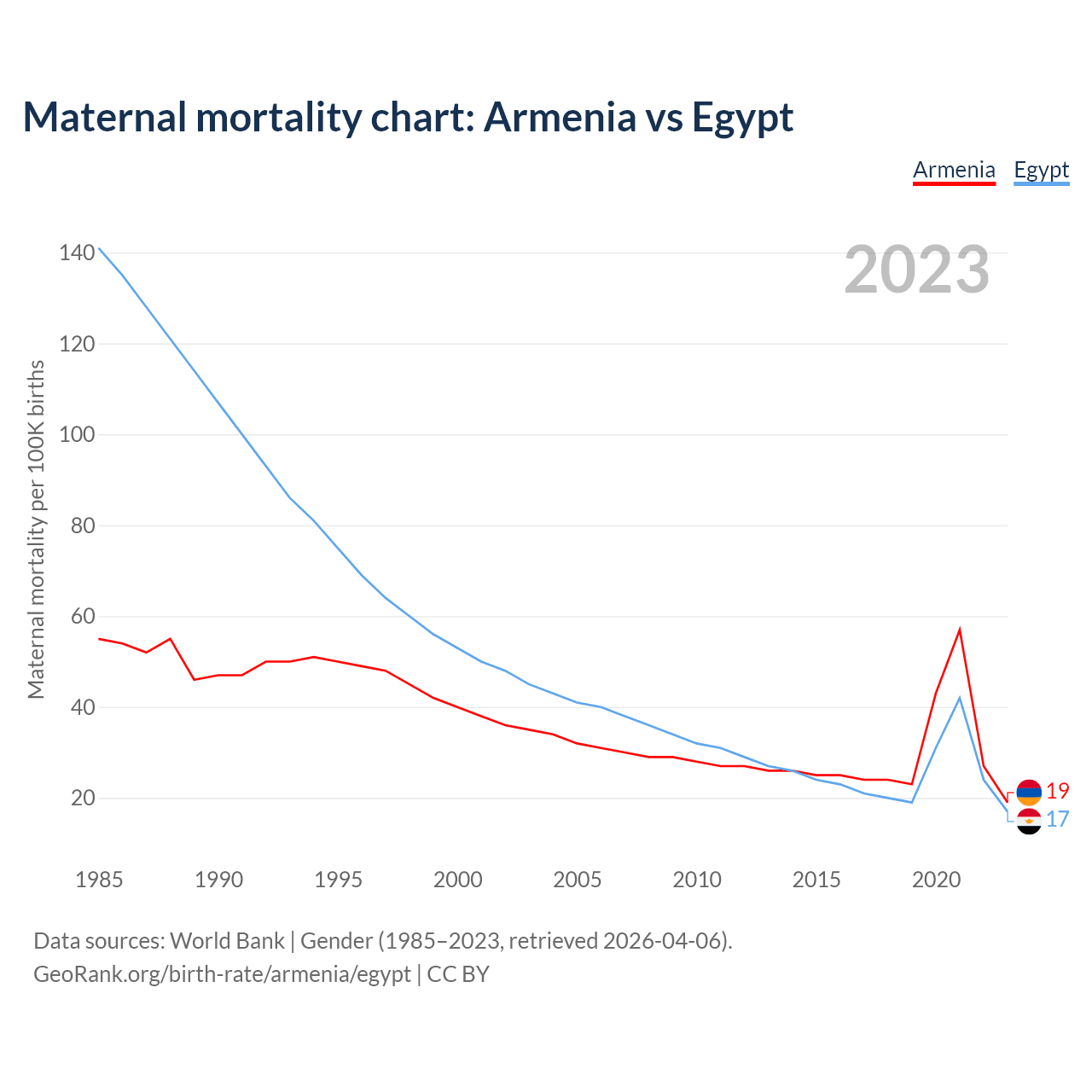 The maternal mortality rate, which is the probability of dying during childbirth or within 42 days of pregnancy termination, is 19 deaths per 100,000 live births in Armenia, compared to 17 deaths in Egypt.