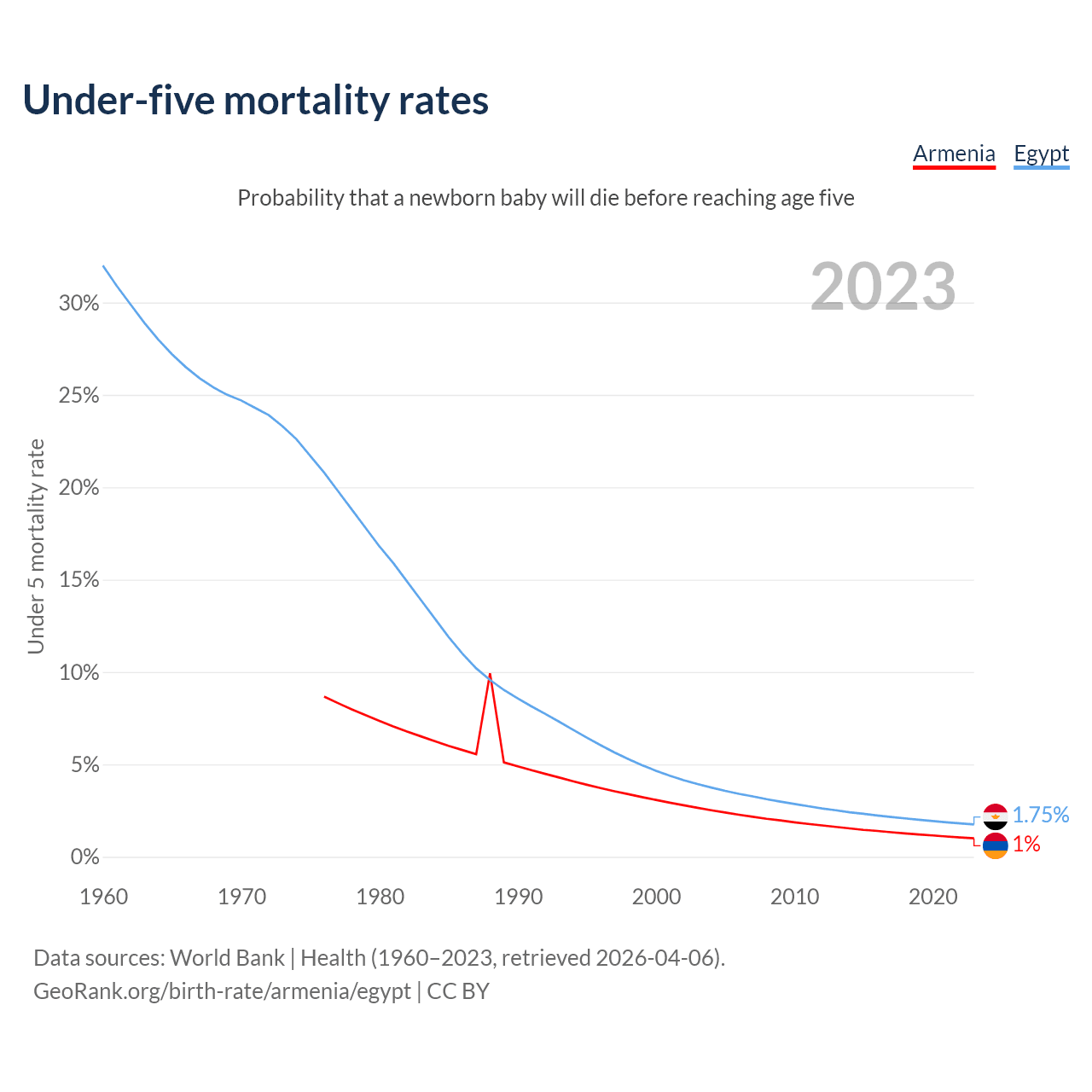 The chance that a newborn baby will die before reaching age five is 1% in Armenia and 1.75% in Egypt. Above is a chart with historical data on under-five mortality rates.