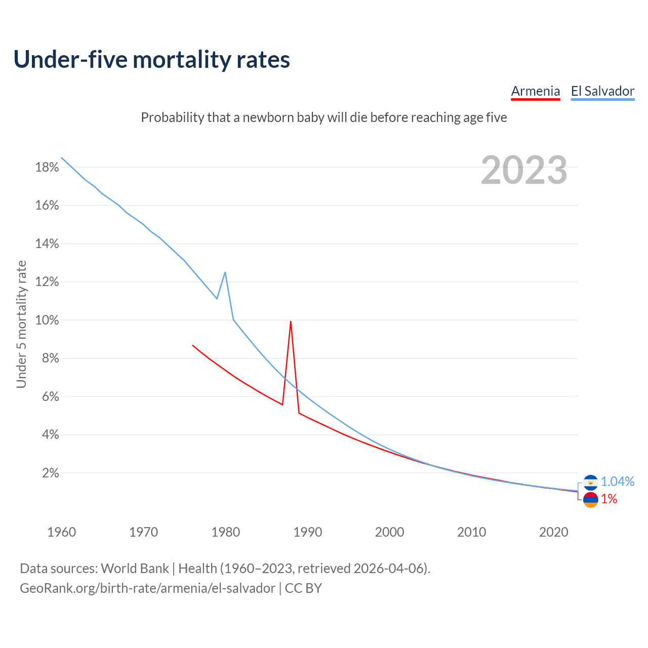 The chance that a newborn baby will die before reaching age five is 1% in Armenia and 1.04% in El Salvador. Above is a chart with historical data on under-five mortality rates.