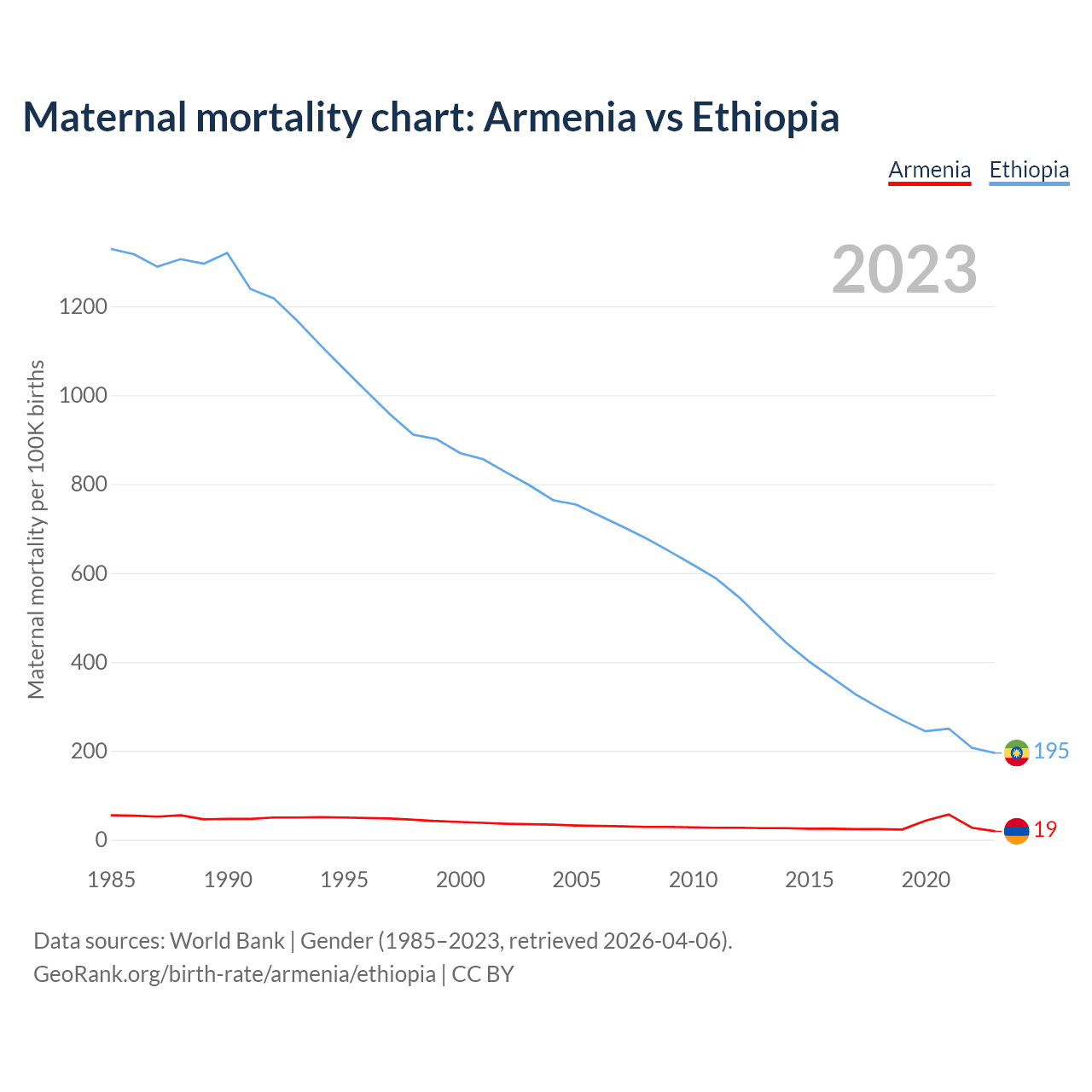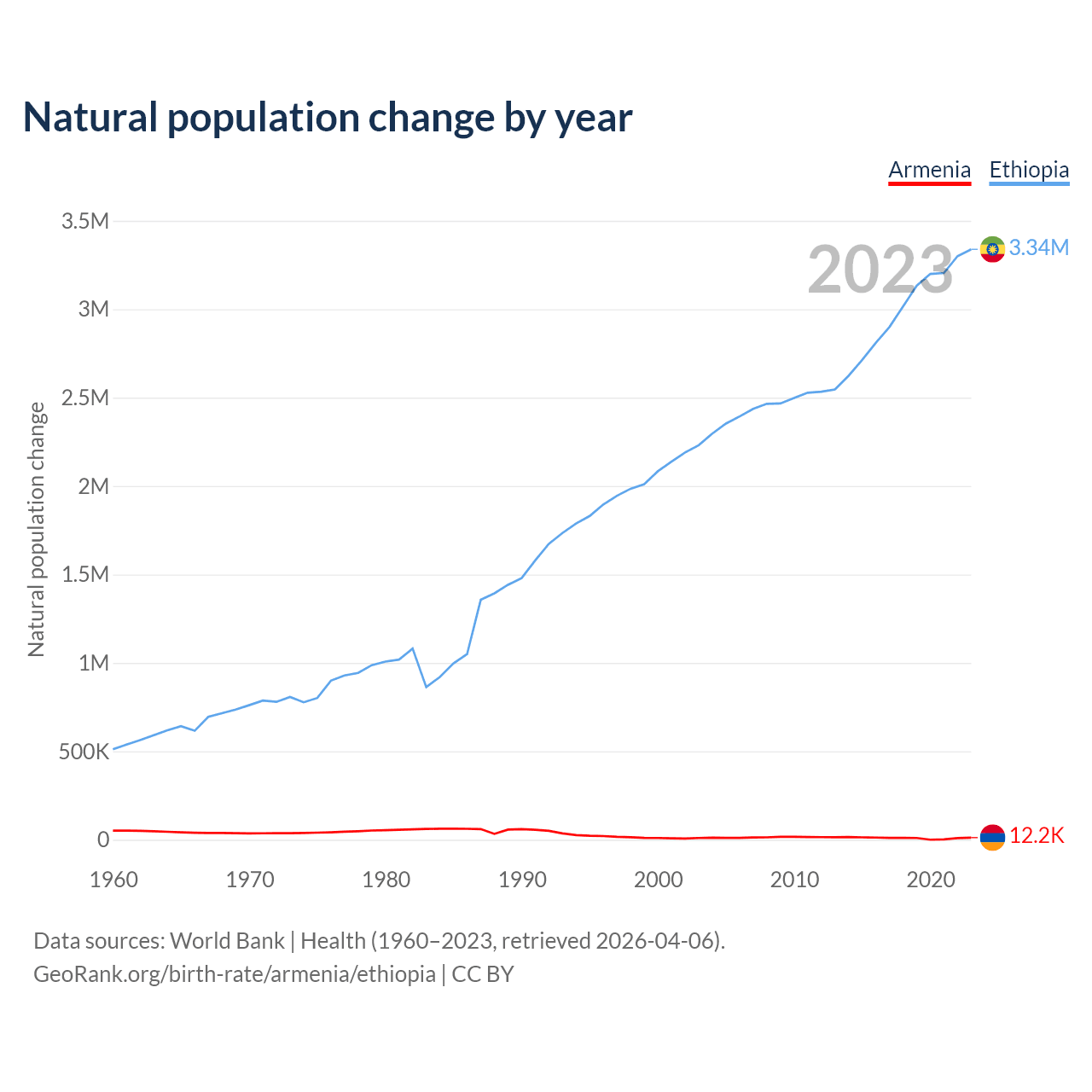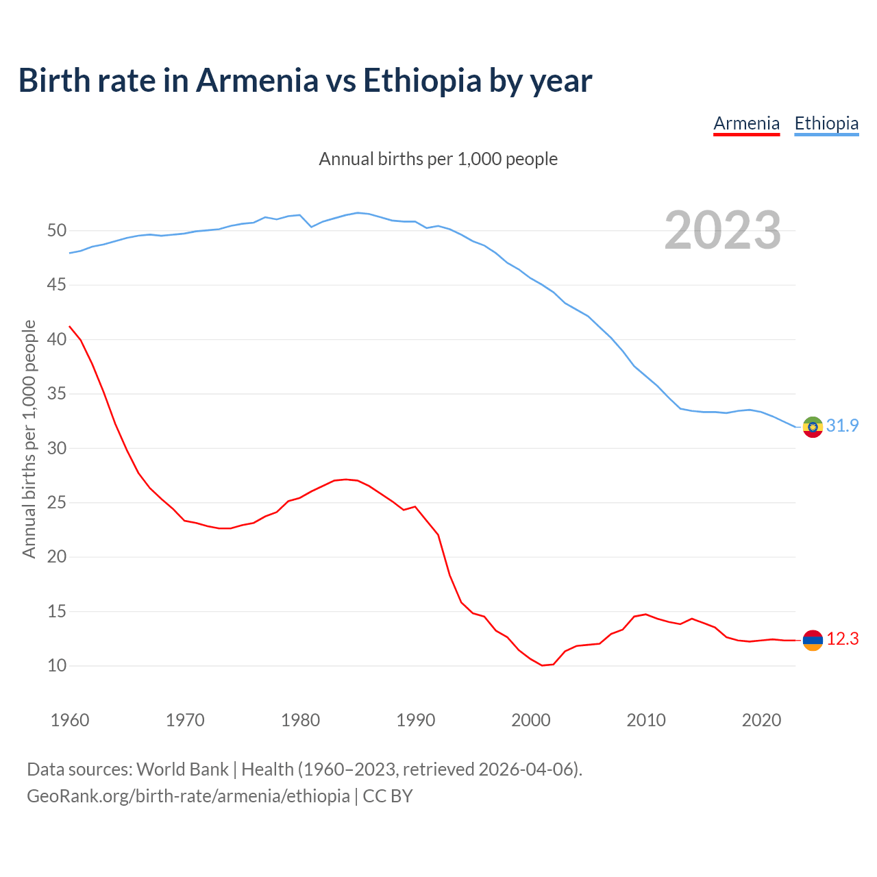 Armenia has an annual birth rate of 12.3 births per 1,000 people, compared to 31.9 for Ethiopia. The average number of children a woman is expected to have during her lifetime — the fertility rate, is 1.9 in Armenia and 3.99 in Ethiopia — 109.9% difference.
