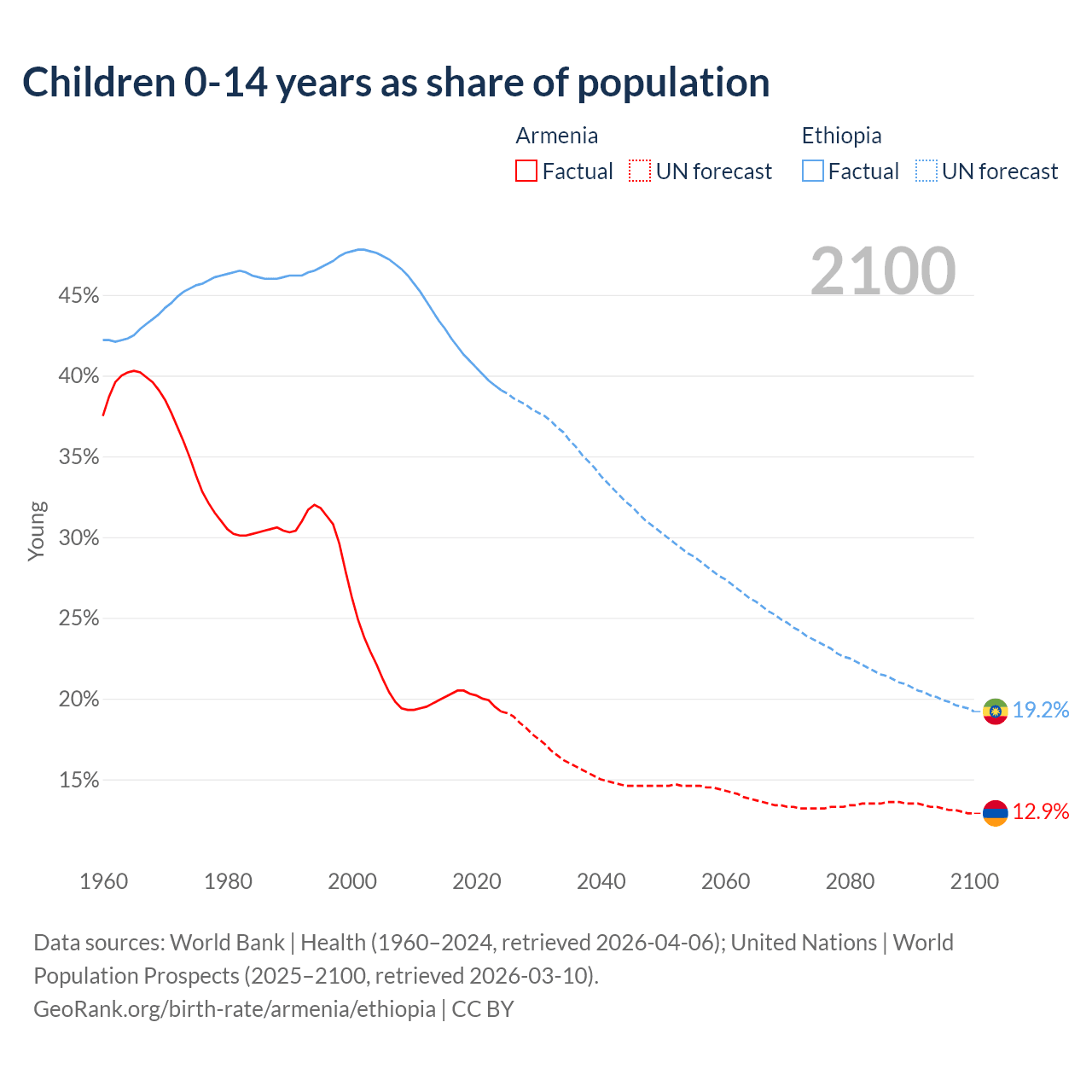 According to the latest available data on birth rates, the fertility rate in Armenia was 1.9 children per woman in 2023, compared to 3.99 in Ethiopia in 2023. The replacement level is considered to be 2.1 children per woman.