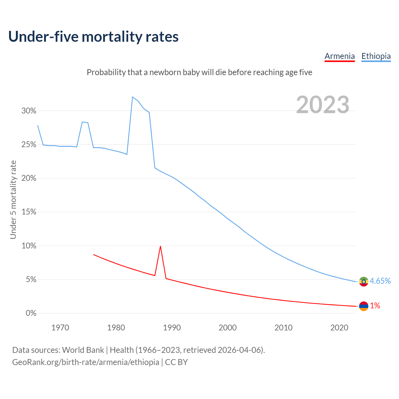The chance that a newborn baby will die before reaching age five is 1% in Armenia and 4.65% in Ethiopia. Above is a chart with historical data on under-five mortality rates.