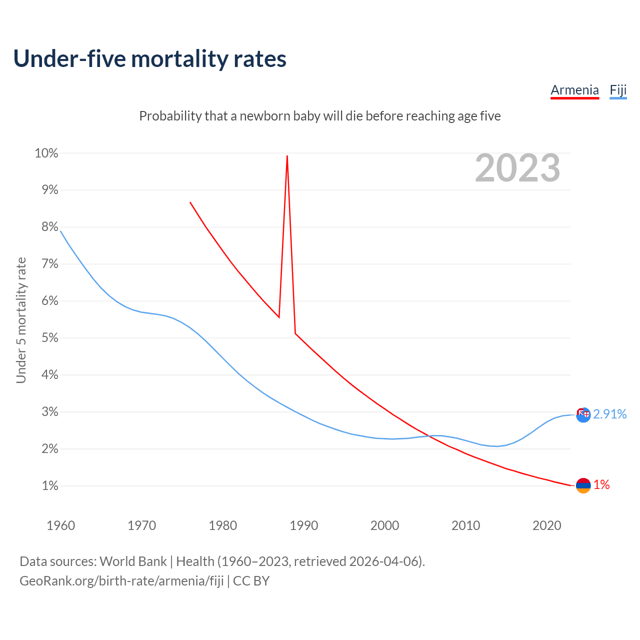 The chance that a newborn baby will die before reaching age five is 1% in Armenia and 2.91% in Fiji. Above is a chart with historical data on under-five mortality rates.