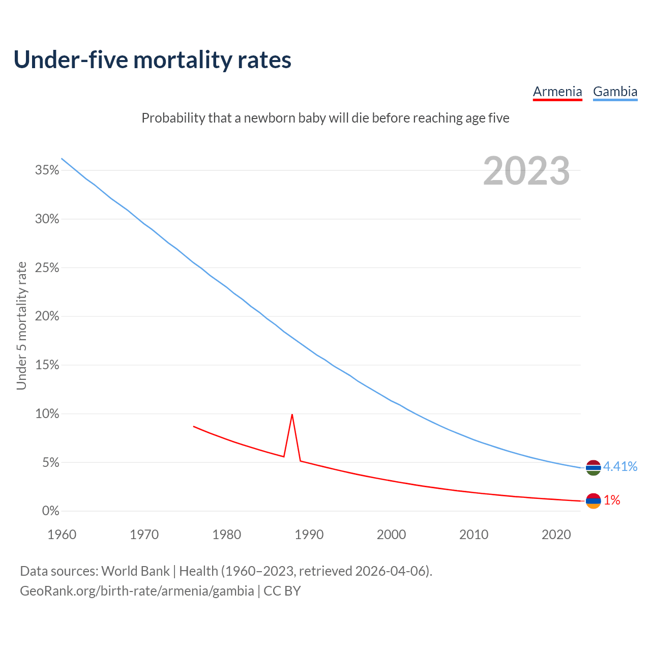 The chance that a newborn baby will die before reaching age five is 1% in Armenia and 4.41% in the Gambia. Above is a chart with historical data on under-five mortality rates.