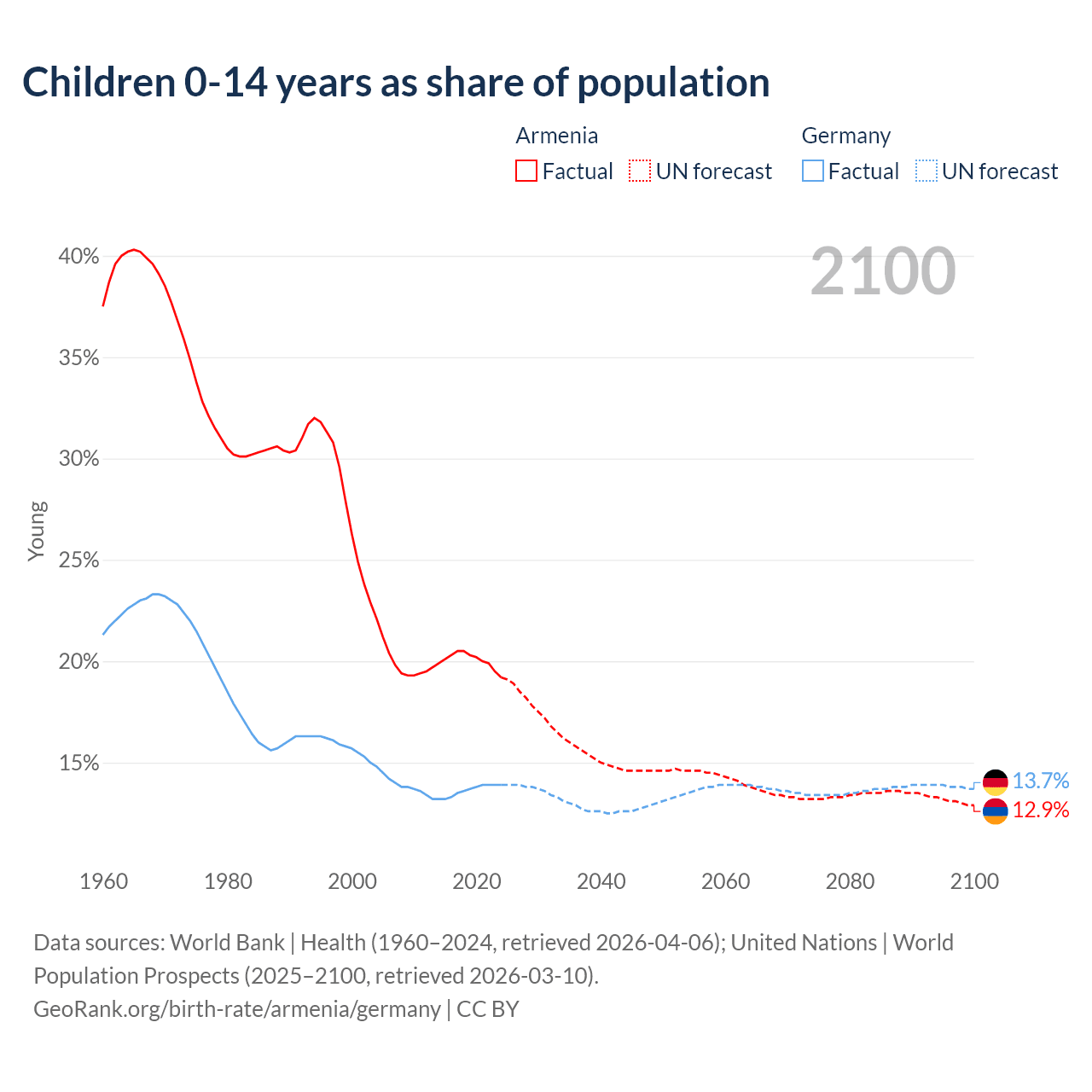 According to the latest available data on birth rates, the fertility rate in Armenia was 1.9 children per woman in 2023, compared to 1.39 in Germany in 2023. The replacement level is considered to be 2.1 children per woman.