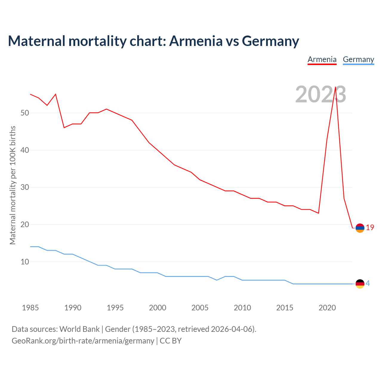 The maternal mortality rate, which is the probability of dying during childbirth or within 42 days of pregnancy termination, is 19 deaths per 100,000 live births in Armenia, compared to 4 deaths in Germany.