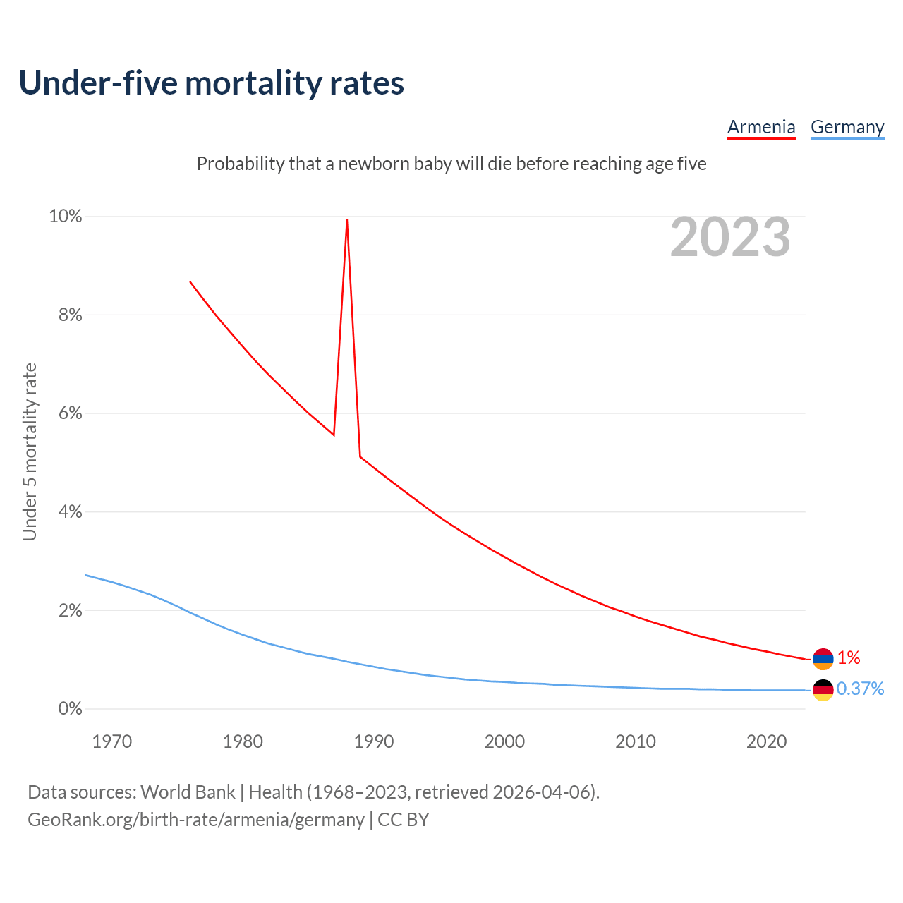 The chance that a newborn baby will die before reaching age five is 1% in Armenia and 0.37% in Germany. Above is a chart with historical data on under-five mortality rates.