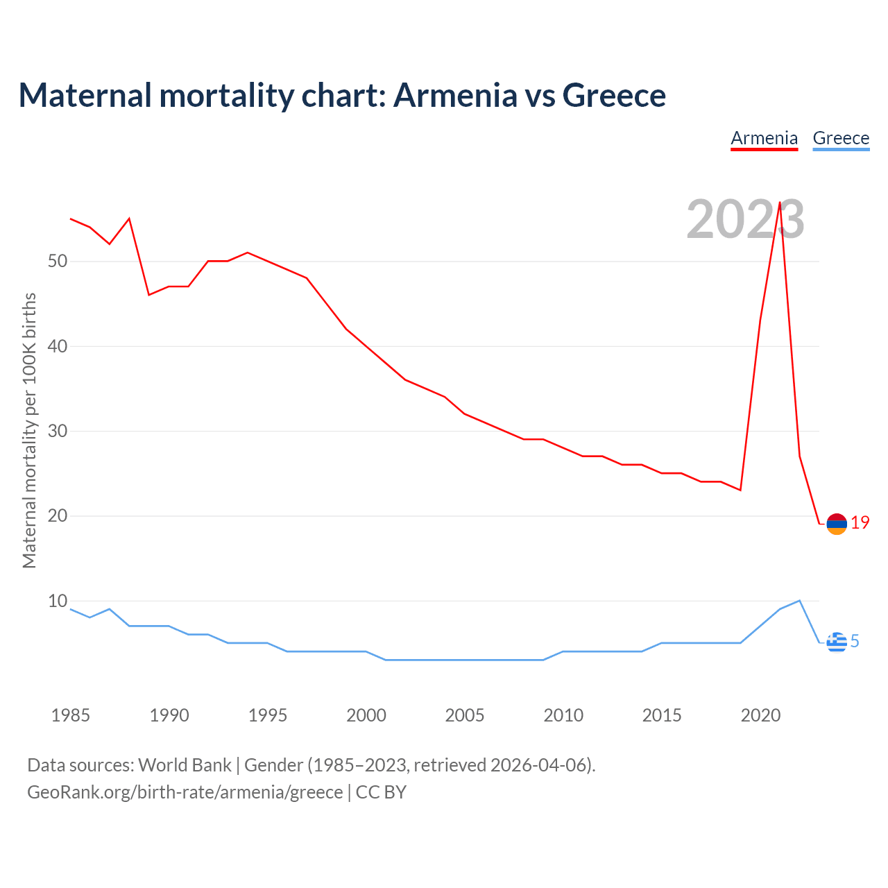 The maternal mortality rate, which is the probability of dying during childbirth or within 42 days of pregnancy termination, is 19 deaths per 100,000 live births in Armenia, compared to 5 deaths in Greece.