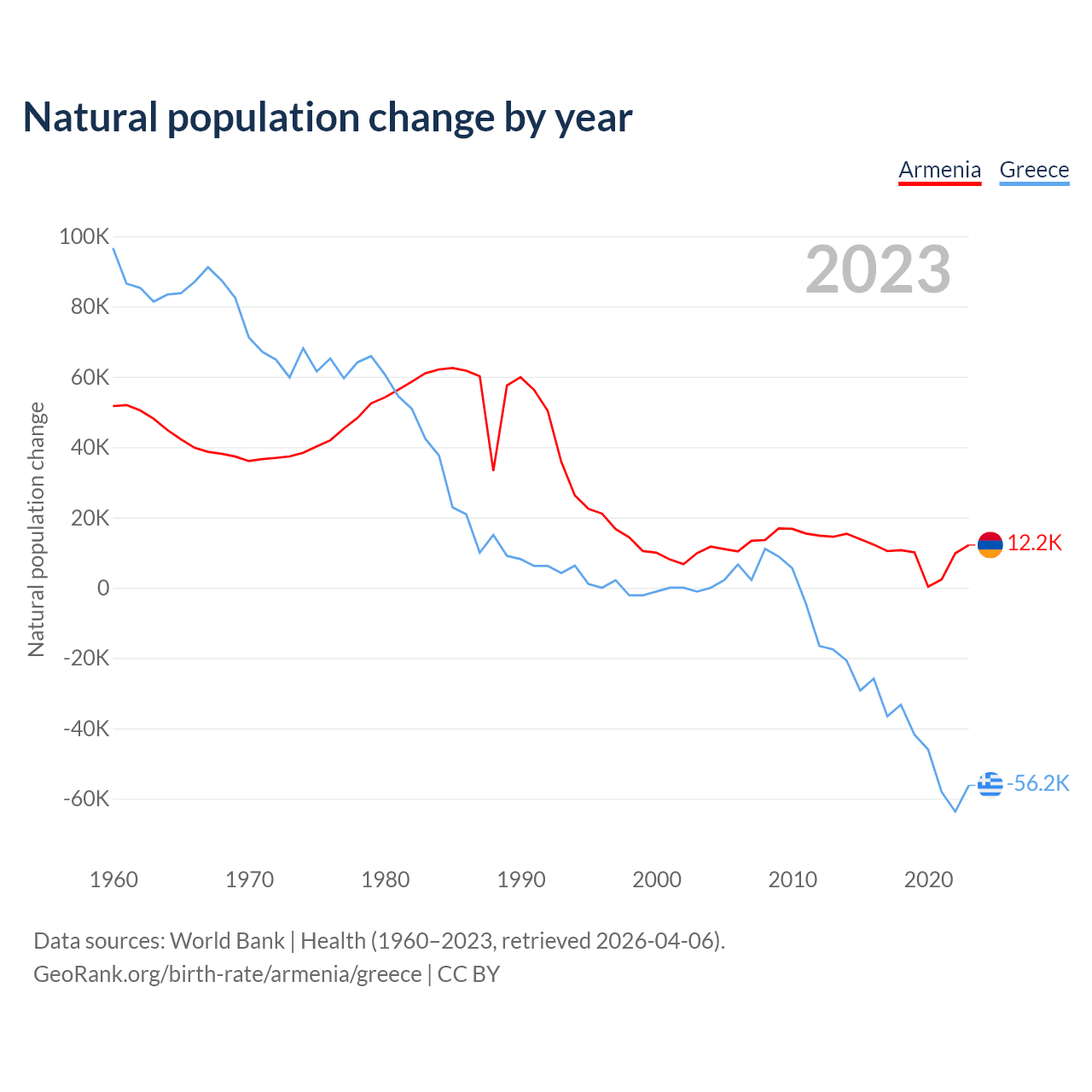 According to the latest available data on birth rates, the fertility rate in Armenia was 1.9 children per woman in 2023, compared to 1.32 in Greece in 2023. The replacement level is considered to be 2.1 children per woman.
