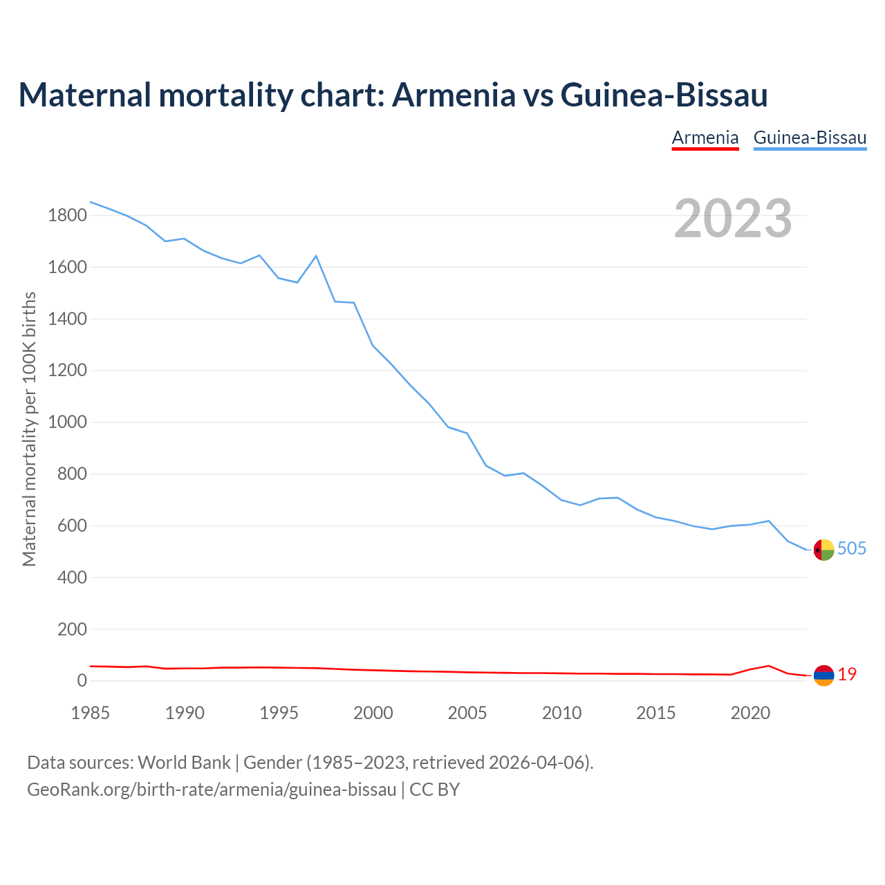 The maternal mortality rate, which is the probability of dying during childbirth or within 42 days of pregnancy termination, is 19 deaths per 100,000 live births in Armenia, compared to 505 deaths in Guinea-Bissau.