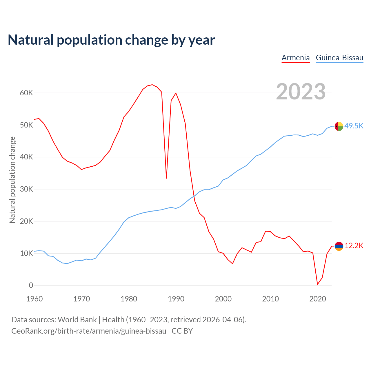 Armenia has an annual birth rate of 12.3 births per 1,000 people, compared to 30 for Guinea-Bissau. The average number of children a woman is expected to have during her lifetime — the fertility rate, is 1.9 in Armenia and 3.84 in Guinea-Bissau — 101.9% difference.