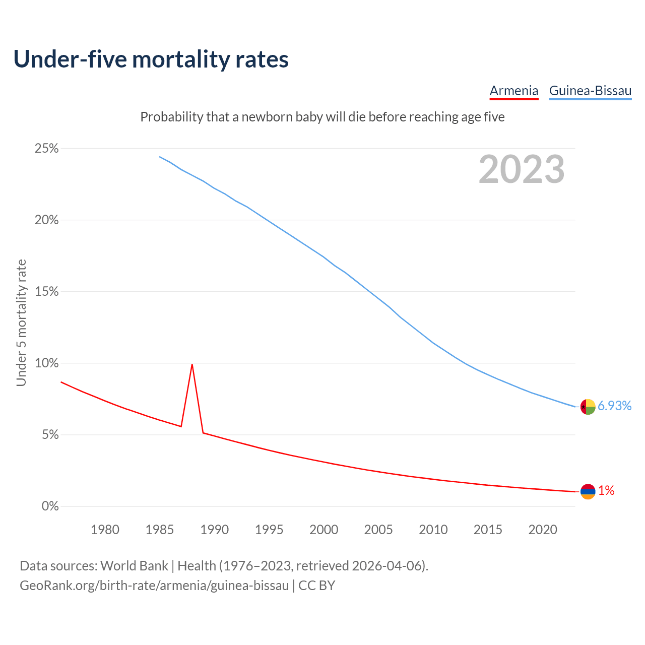 The chance that a newborn baby will die before reaching age five is 1% in Armenia and 6.93% in Guinea-Bissau. Above is a chart with historical data on under-five mortality rates.