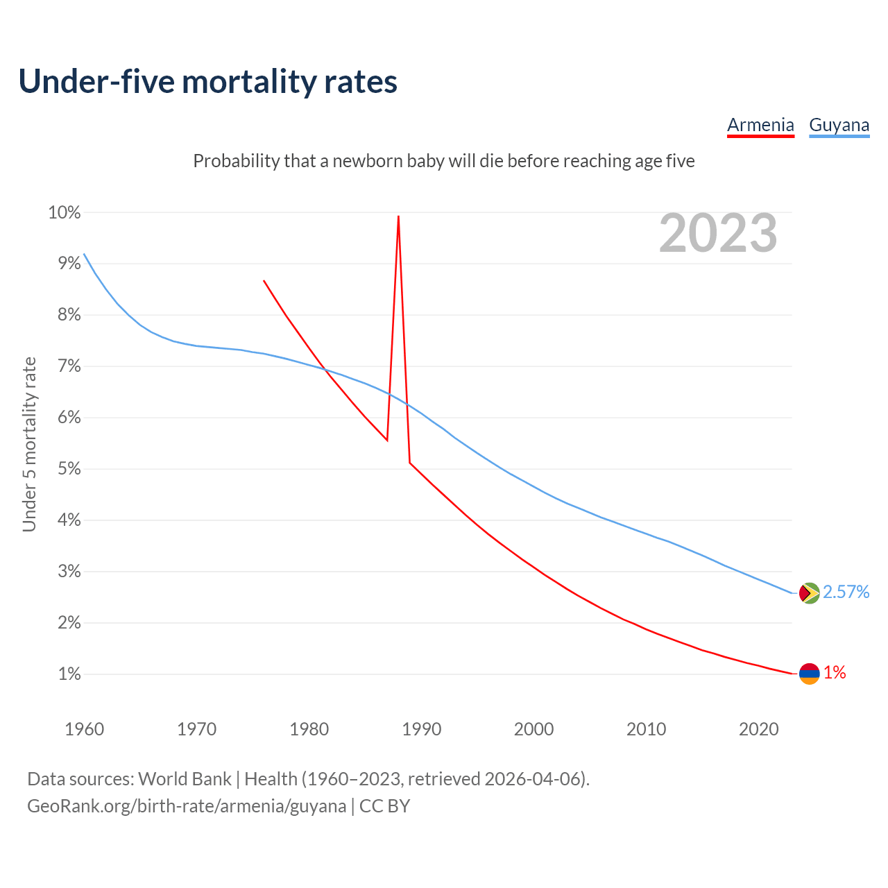 The chance that a newborn baby will die before reaching age five is 1% in Armenia and 2.57% in Guyana. Above is a chart with historical data on under-five mortality rates.