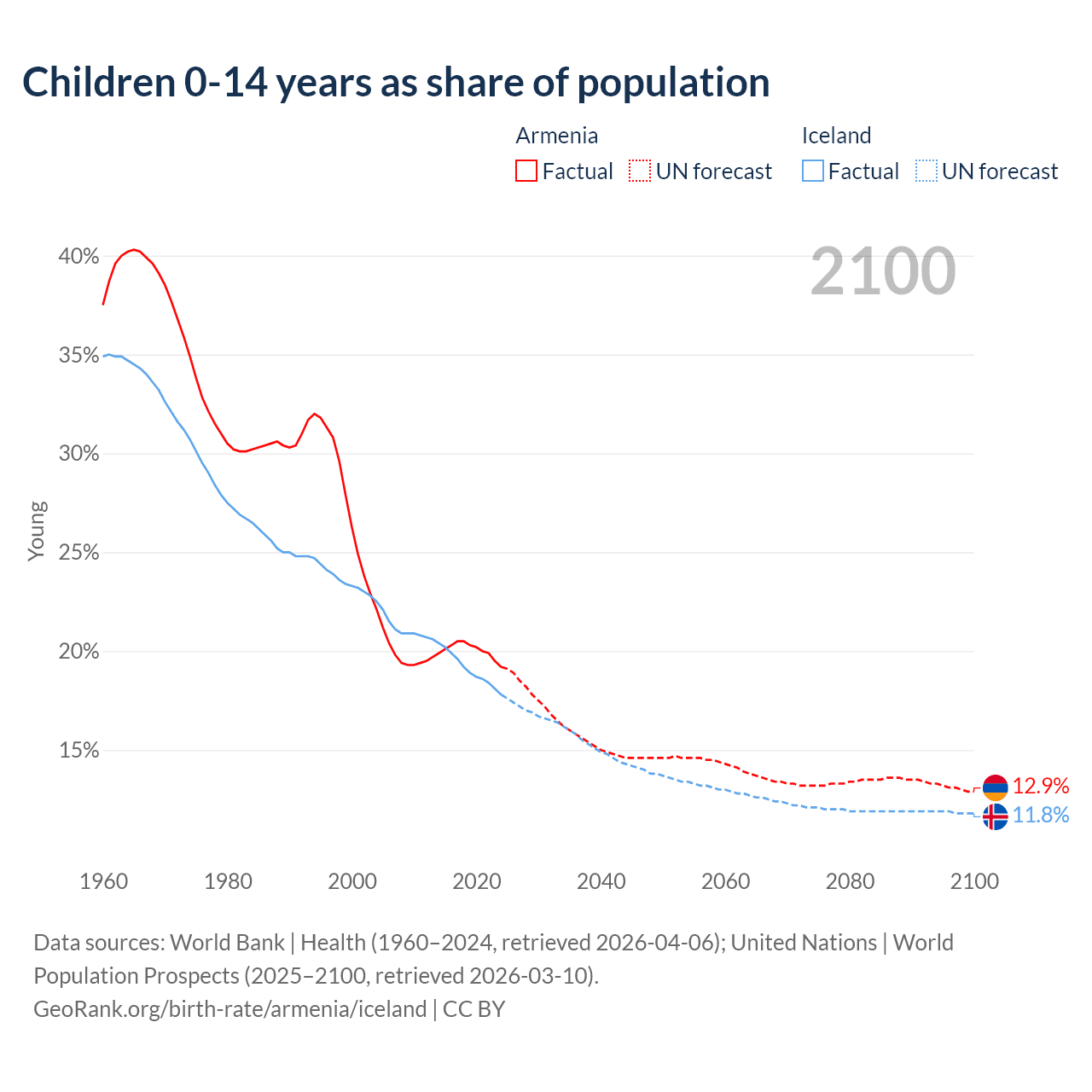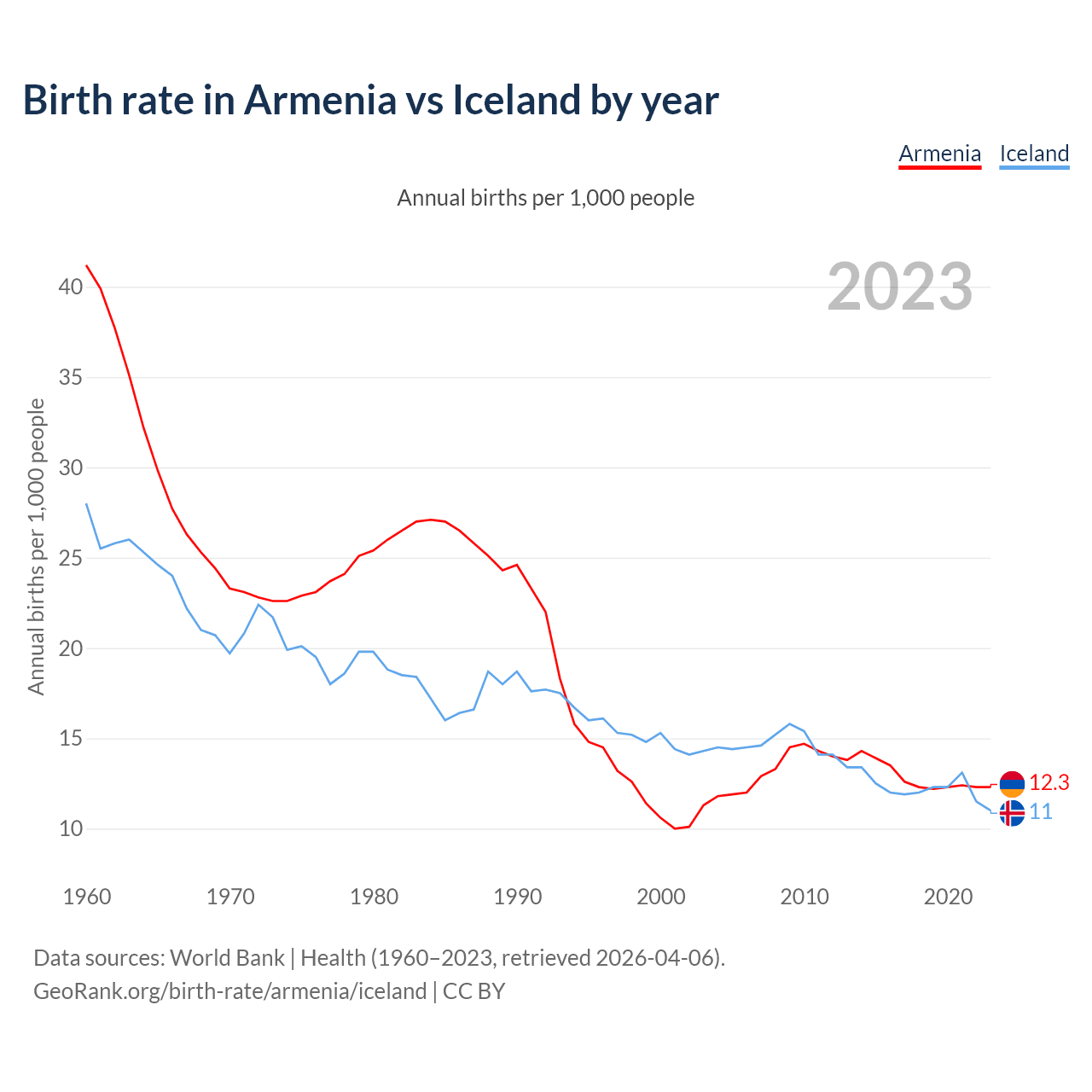 According to the latest available data on birth rates, the fertility rate in Armenia was 1.9 children per woman in 2023, compared to 1.59 in Iceland in 2023. The replacement level is considered to be 2.1 children per woman.