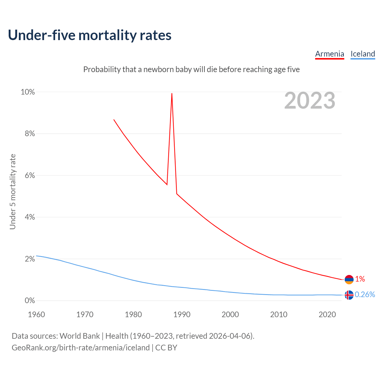 The chance that a newborn baby will die before reaching age five is 1% in Armenia and 0.26% in Iceland. Above is a chart with historical data on under-five mortality rates.